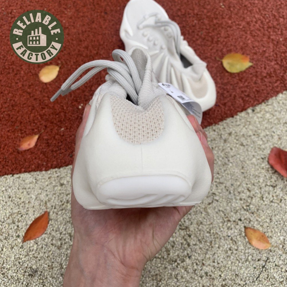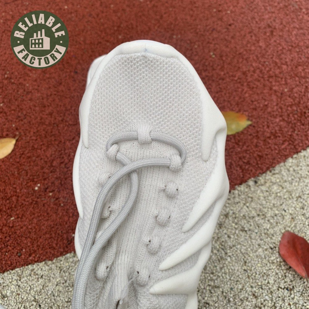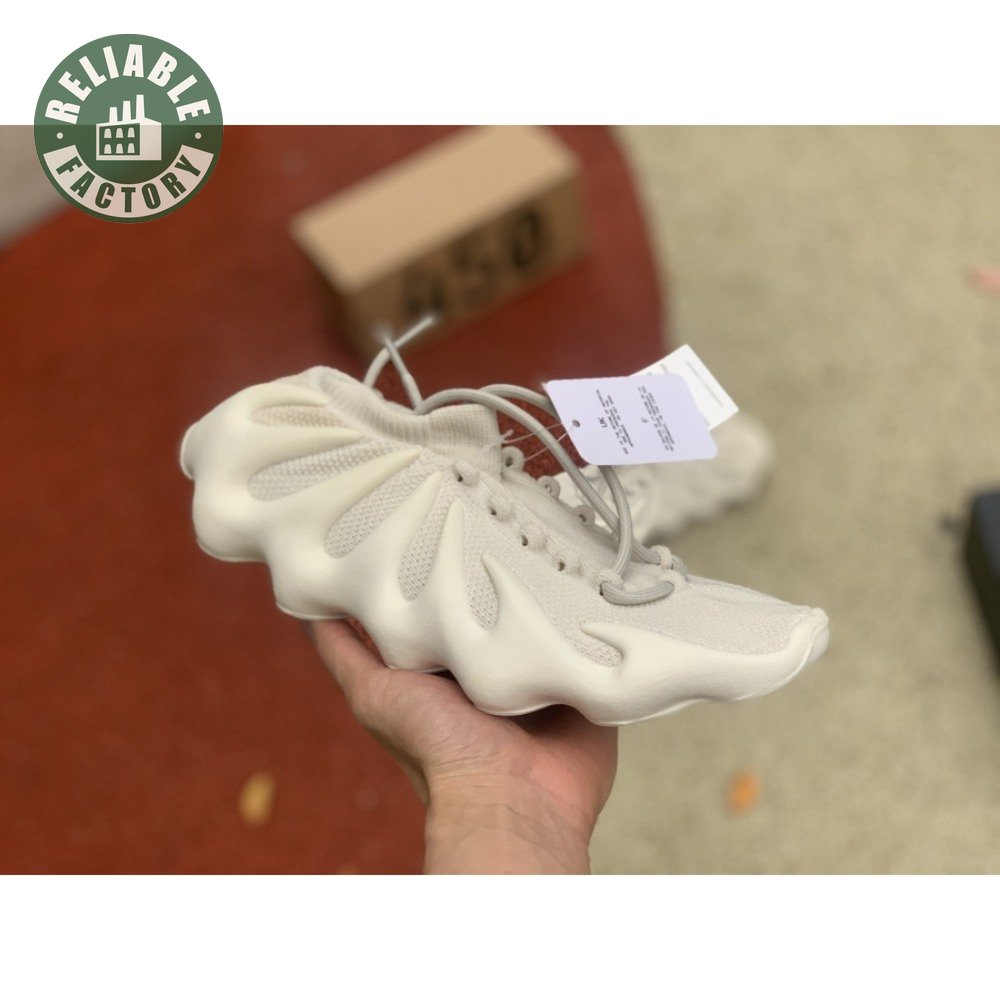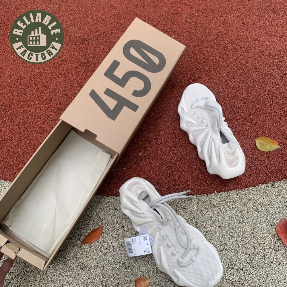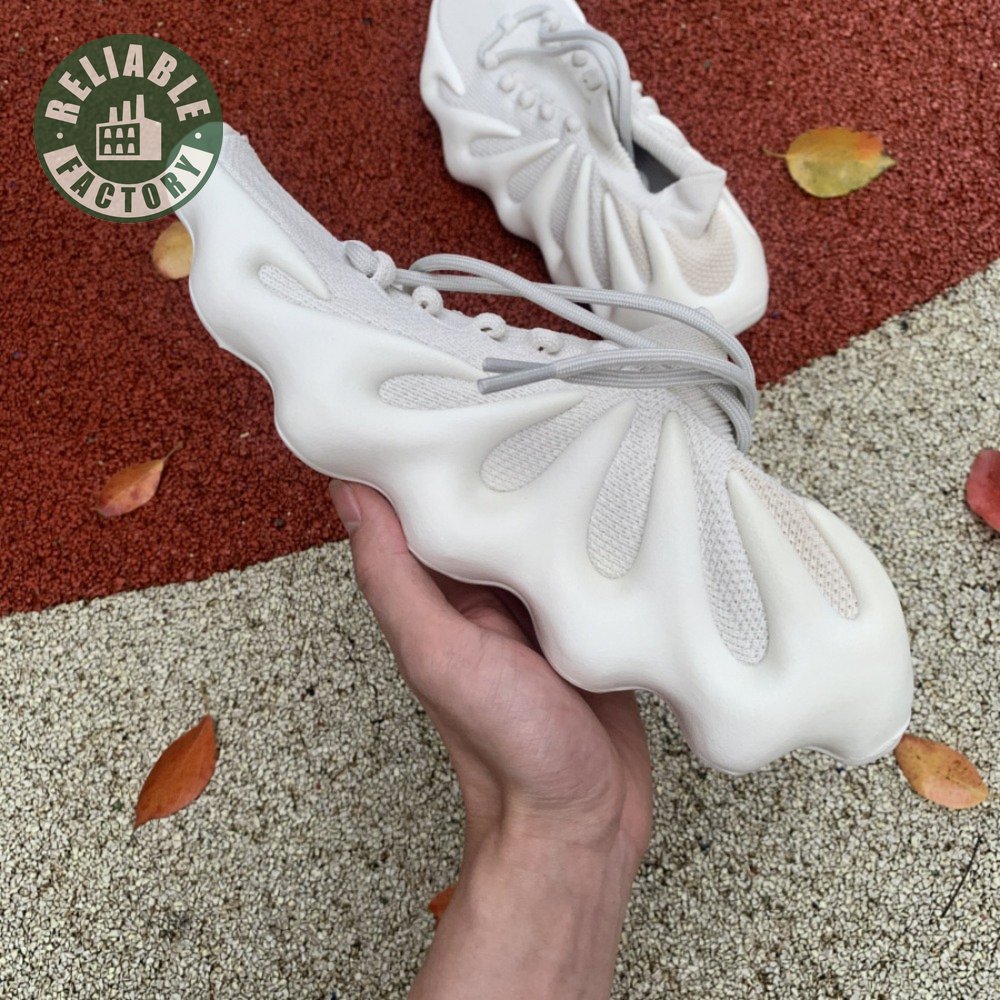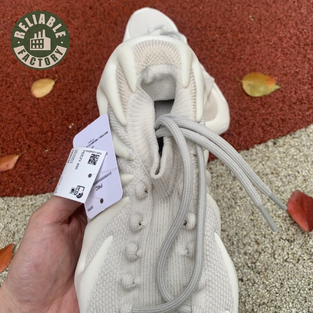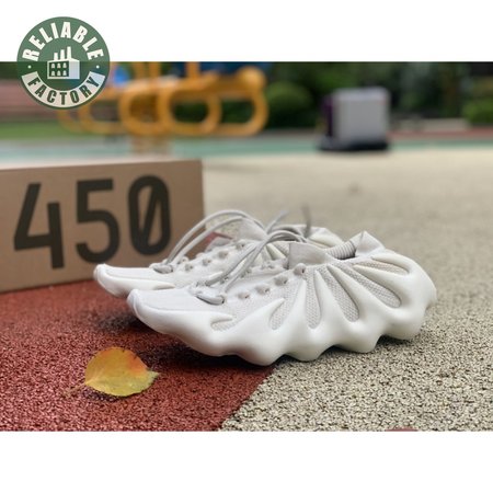 The Yeezy 450 "Cloud White" highlights neutral hues on a deconstructed sneaker developed with a design assist from Steve Smith, the mastermind behind iconic silhouettes ranging from the New Balance 997 to the Reebok Instapump Fury. Exterior branding is stripped from the one-piece knit textile upper, secured with an elastic cuff and an integrated lacing system. The minimalist design is encroached upon by the unique configuration of the molded outsole, featuring a set of "fingers" that wrap up the side panels.