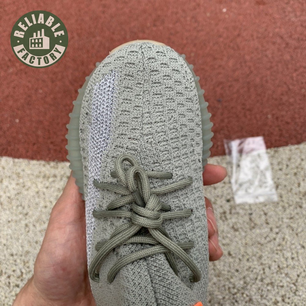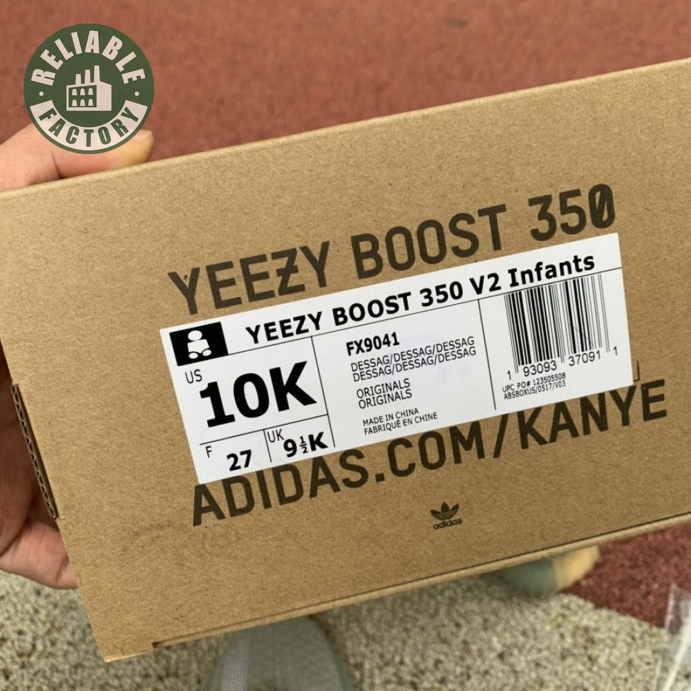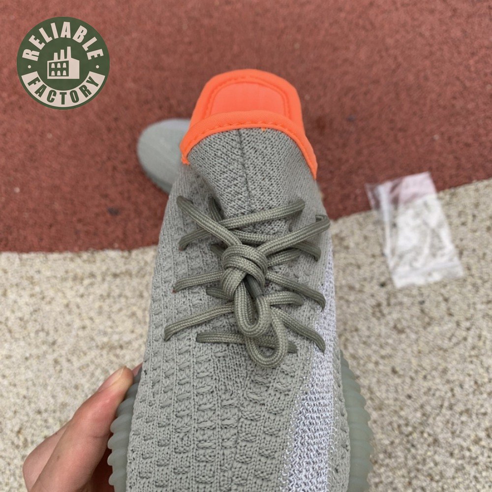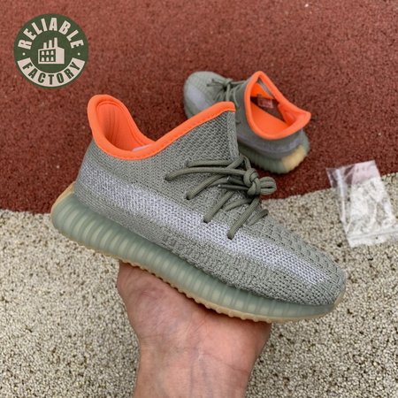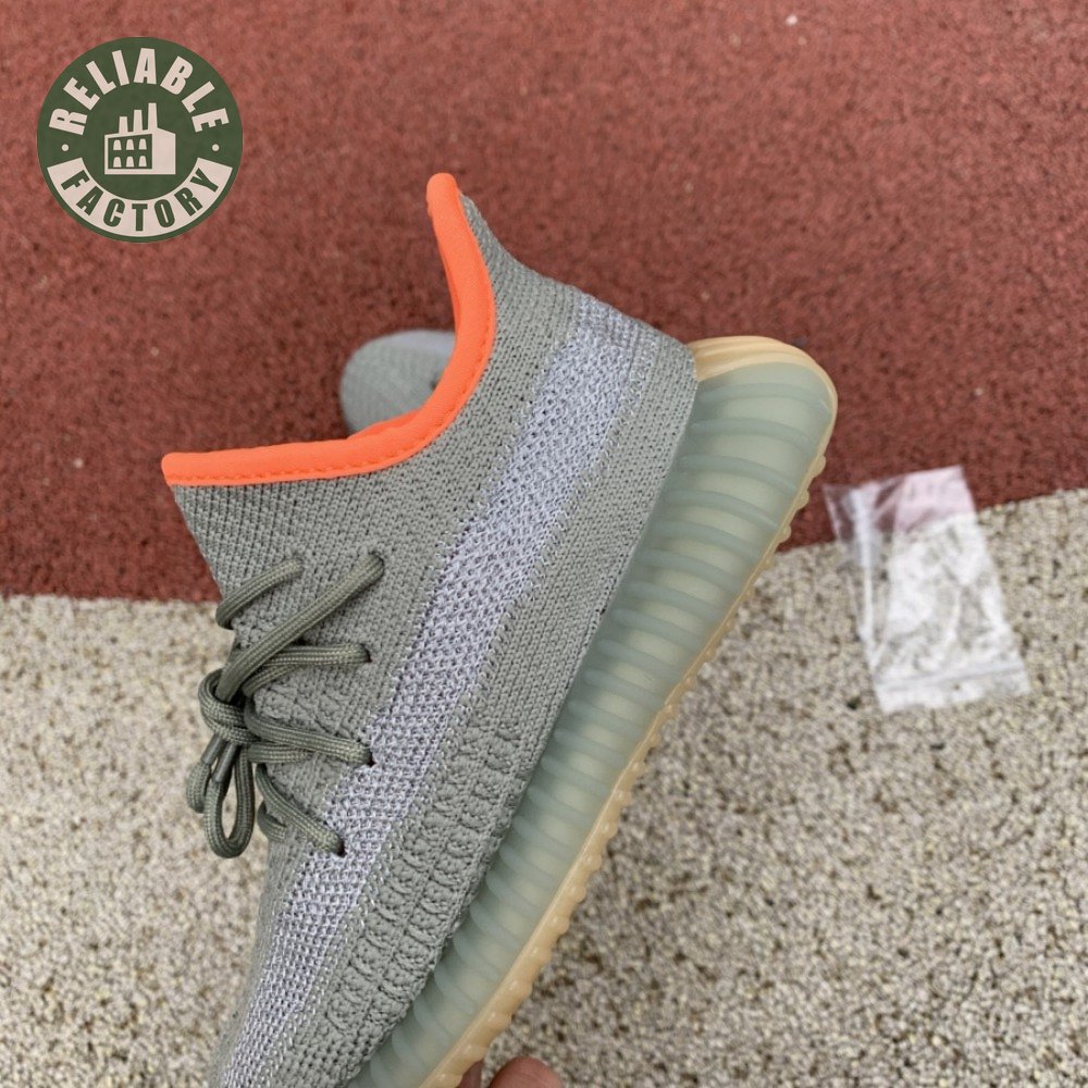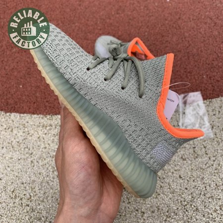 The Yeezy Boost 350 V2 'Desert Sage' is outfitted in a pale green Primeknit upper with tonal rope laces and reflective detailing on the sneaker"s signature side stripe. Contrast pops of color emerge on the orange collar lining and sockliner, the latter printed with dual adidas and Yeezy branding. The minimalist build sits atop full-length Boost midsole, encased in tonal green rubber with grippy gum rubber on the outsole.