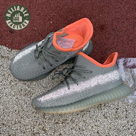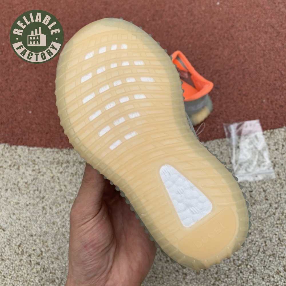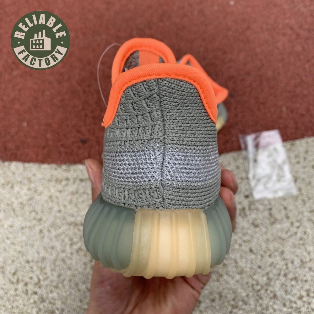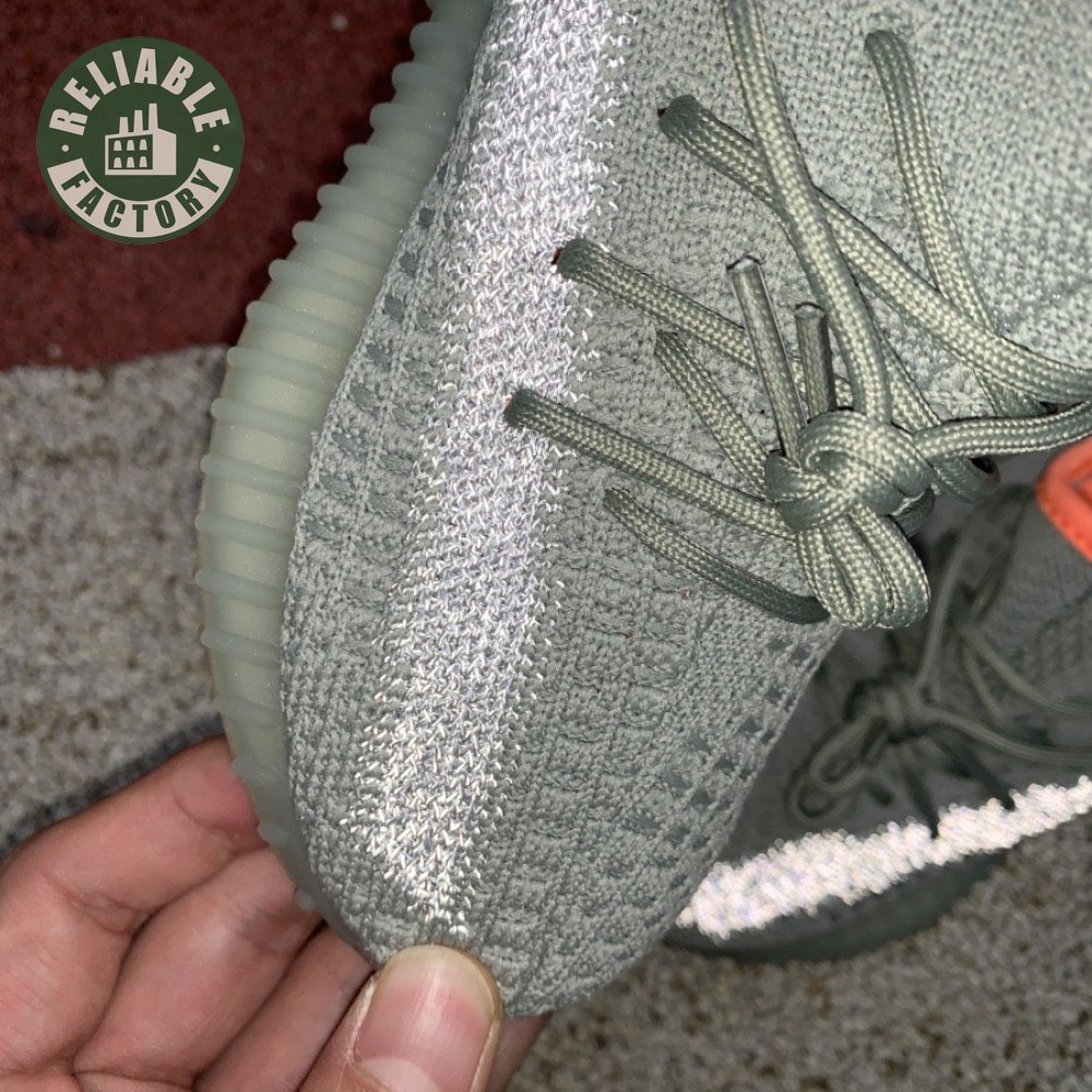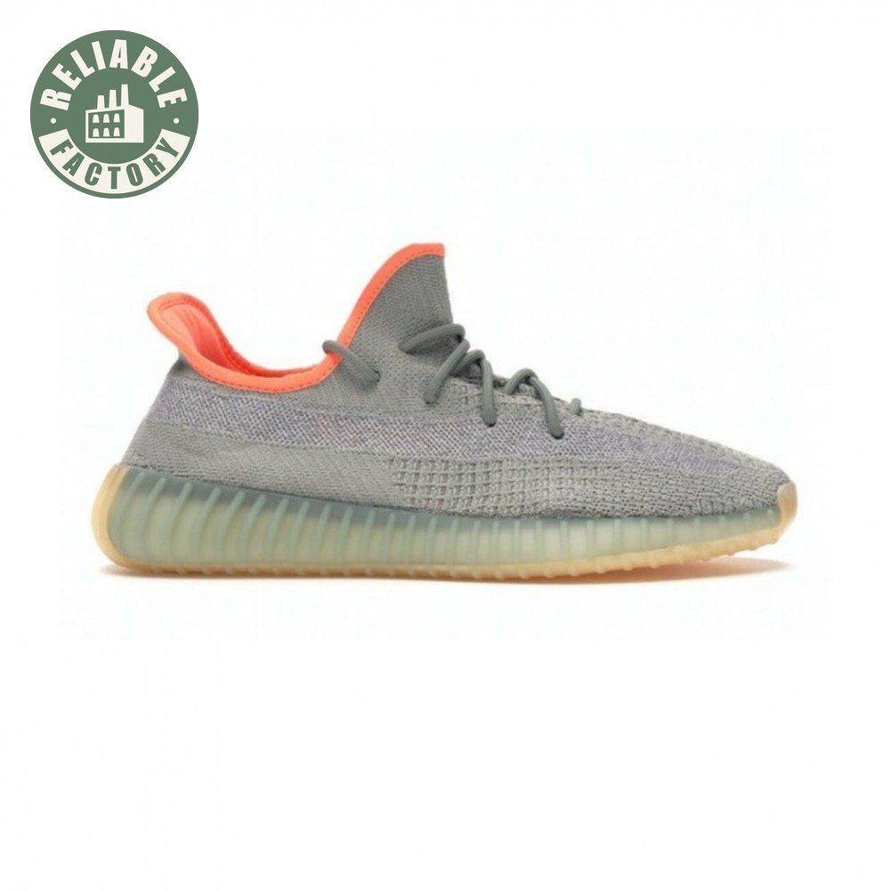 The Yeezy Boost 350 V2 'Desert Sage' is outfitted in a pale green Primeknit upper with tonal rope laces and reflective detailing on the sneaker"s signature side stripe. Contrast pops of color emerge on the orange collar lining and sockliner, the latter printed with dual adidas and Yeezy branding. The minimalist build sits atop full-length Boost midsole, encased in tonal green rubber with grippy gum rubber on the outsole.