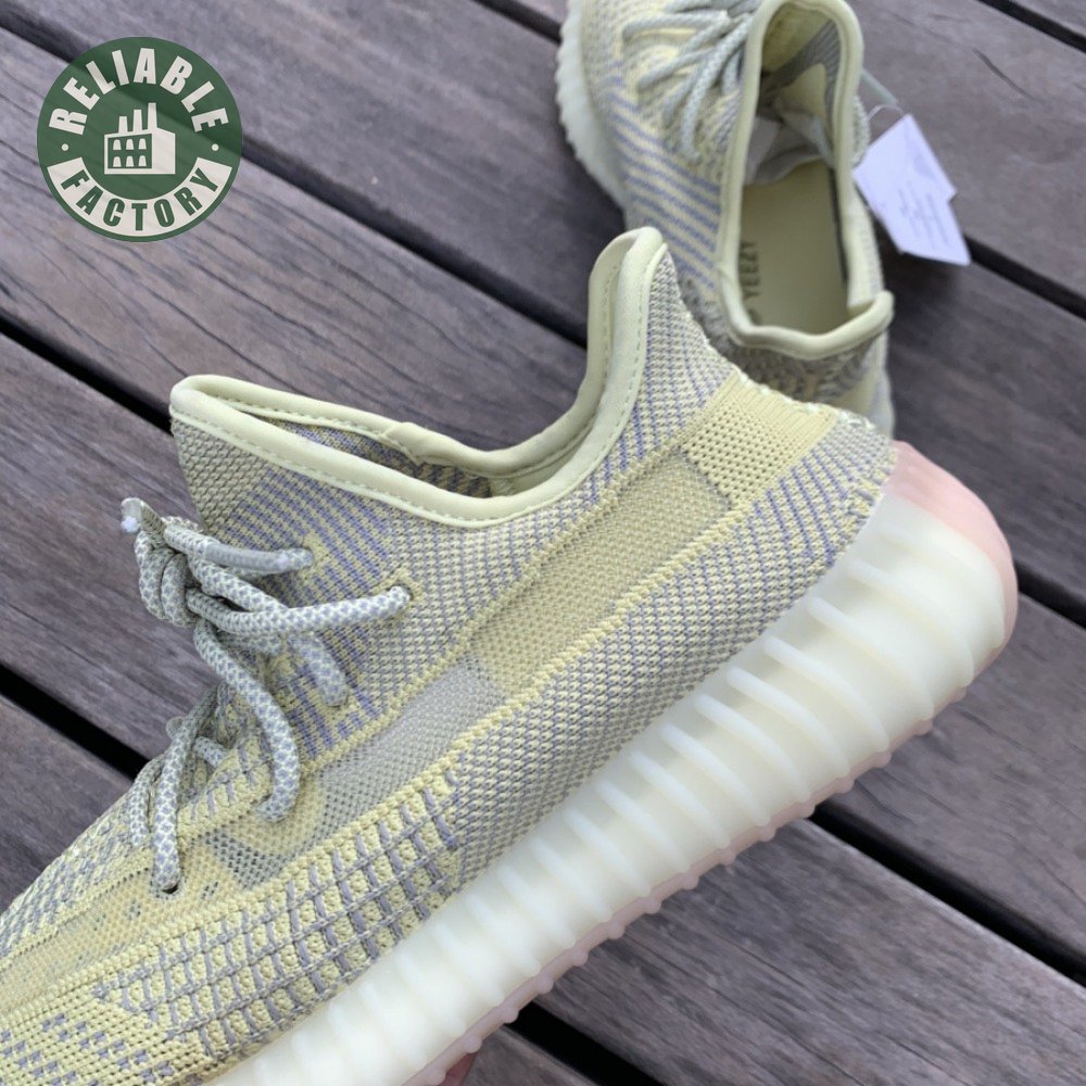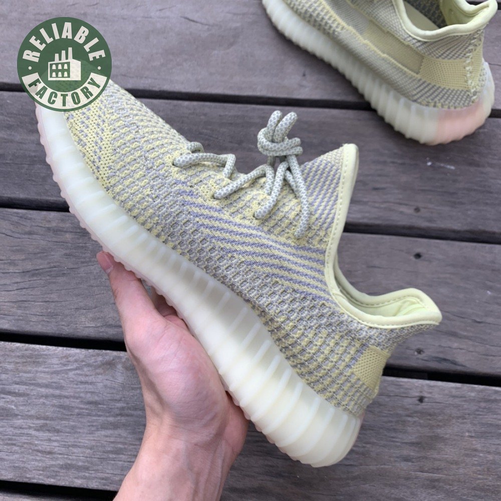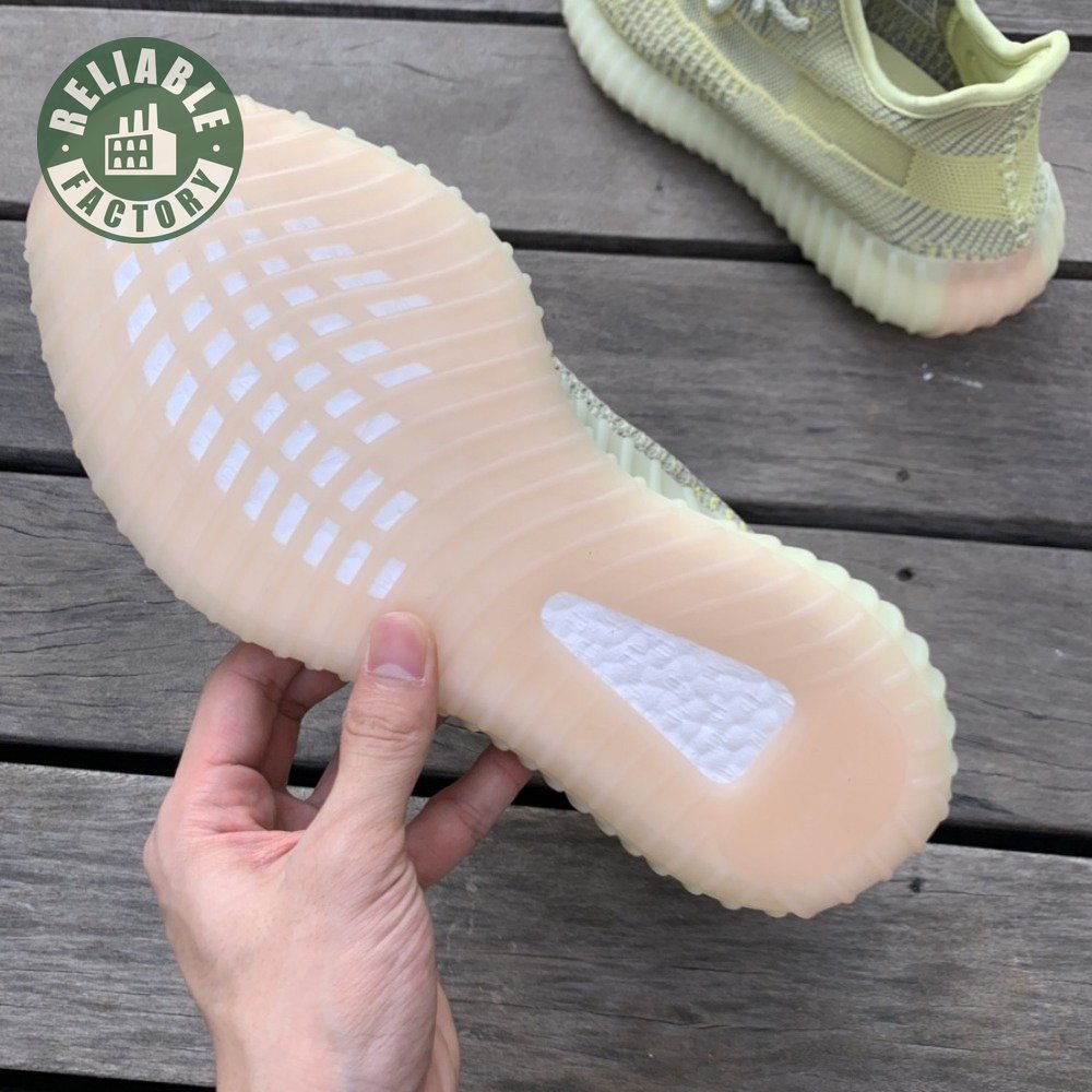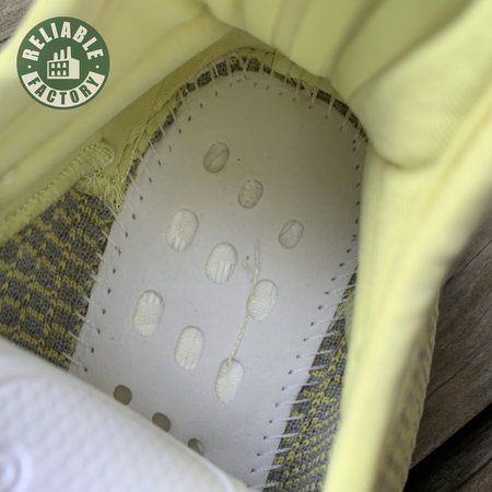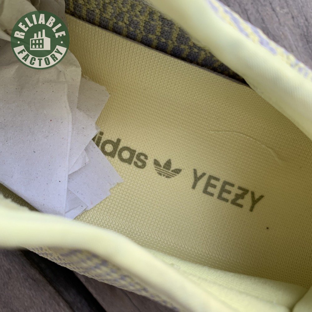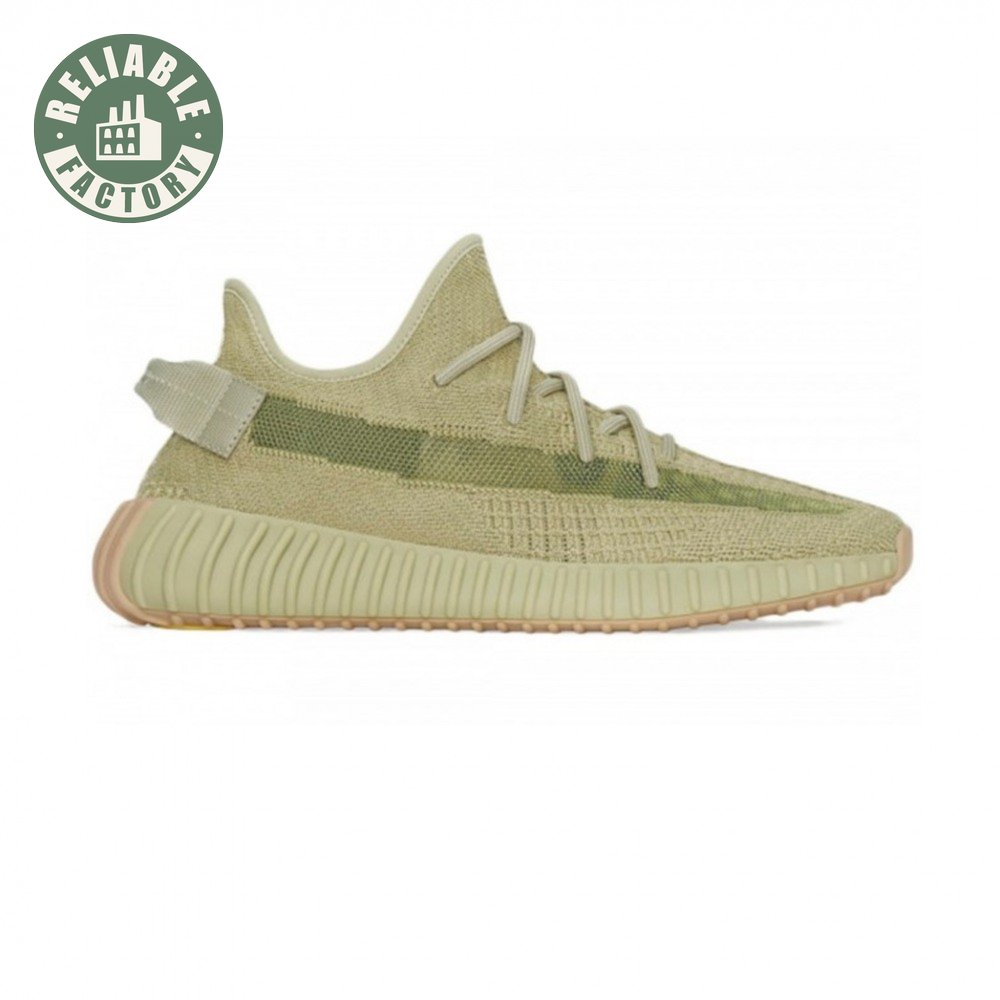The adidas Yeezy Boost 350 V2 "Sulfur" utilizes a breathable Primeknit upper in a yellowish tan hue, accented with the sneaker"s signature monofilament side stripe in olive green. A pull tab at the heel complements the sock-like collar to deliver easy on and off. Underneath the foot, a full-length Boost unit provides responsive cushioning. The foam compound is visible through cut-out detailing on the gum rubber outsole.