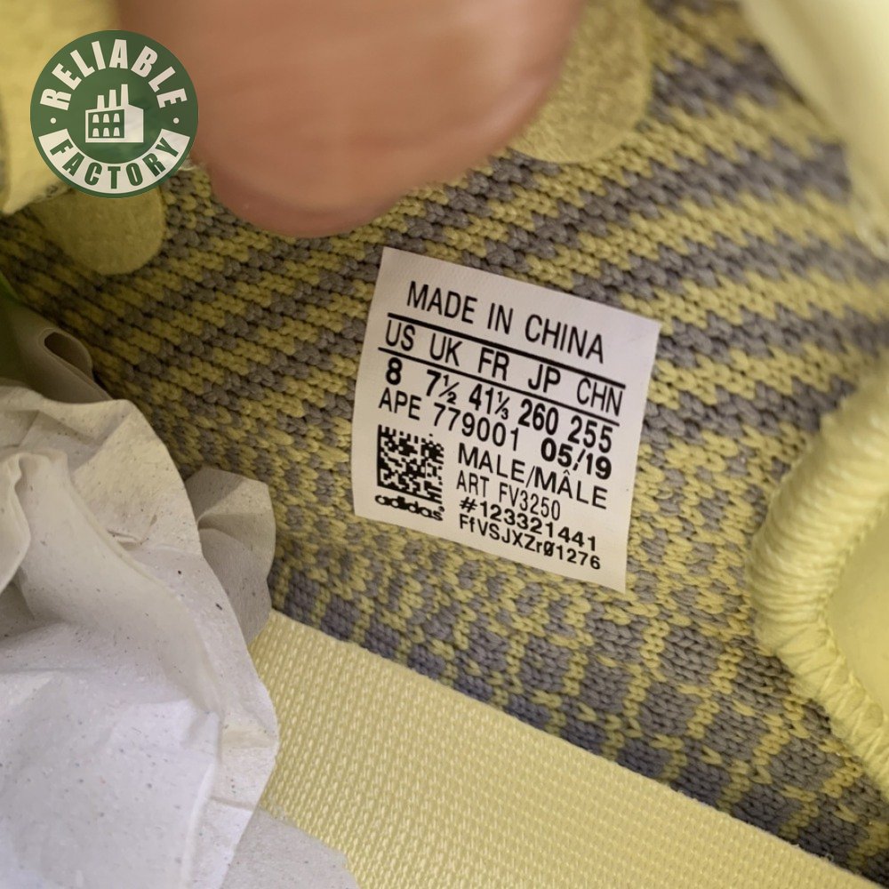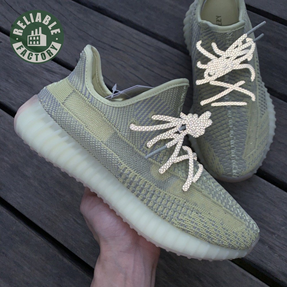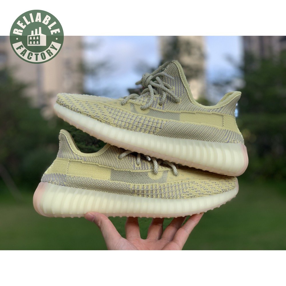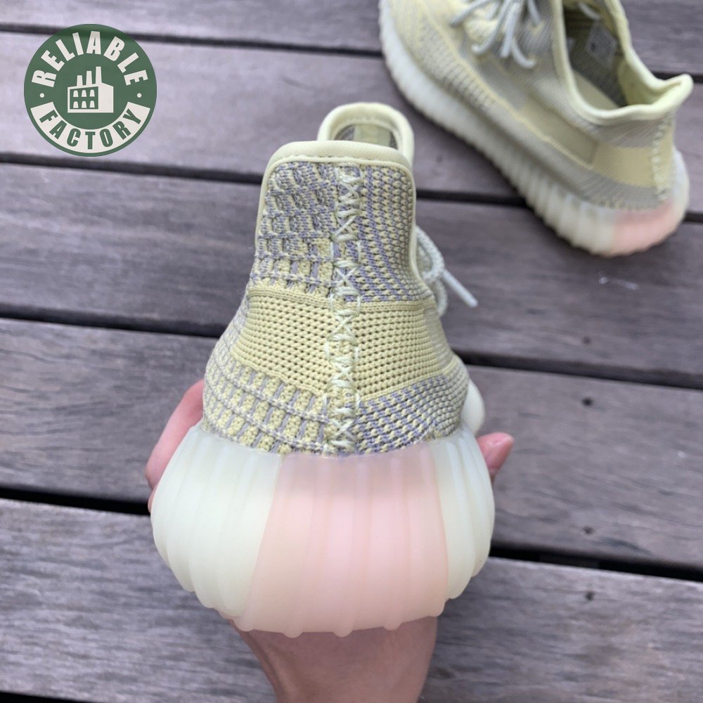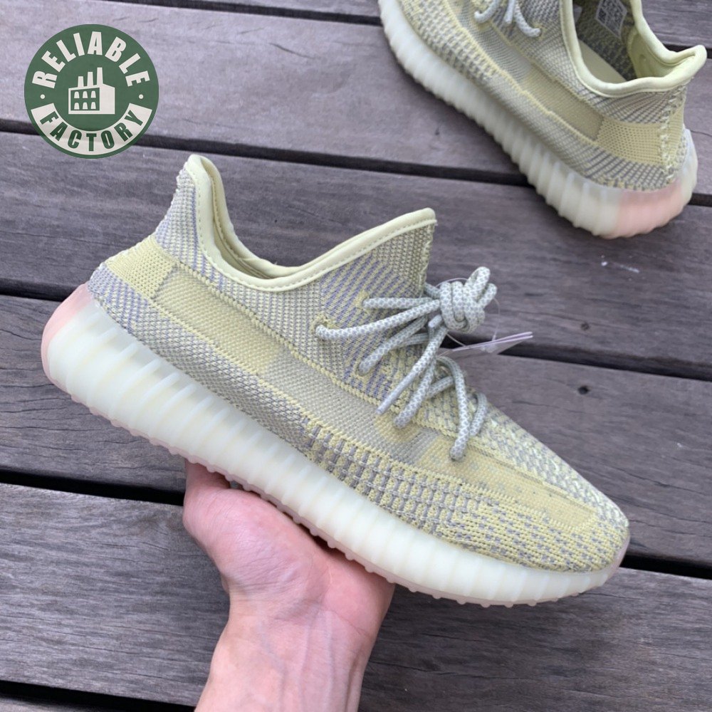 The adidas Yeezy Boost 350 V2 "Sulfur" utilizes a breathable Primeknit upper in a yellowish tan hue, accented with the sneaker"s signature monofilament side stripe in olive green. A pull tab at the heel complements the sock-like collar to deliver easy on and off. Underneath the foot, a full-length Boost unit provides responsive cushioning. The foam compound is visible through cut-out detailing on the gum rubber outsole.