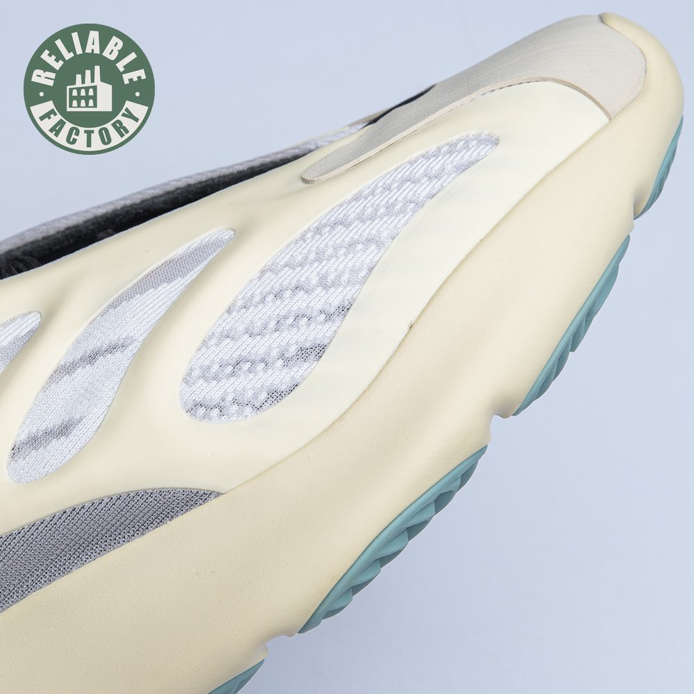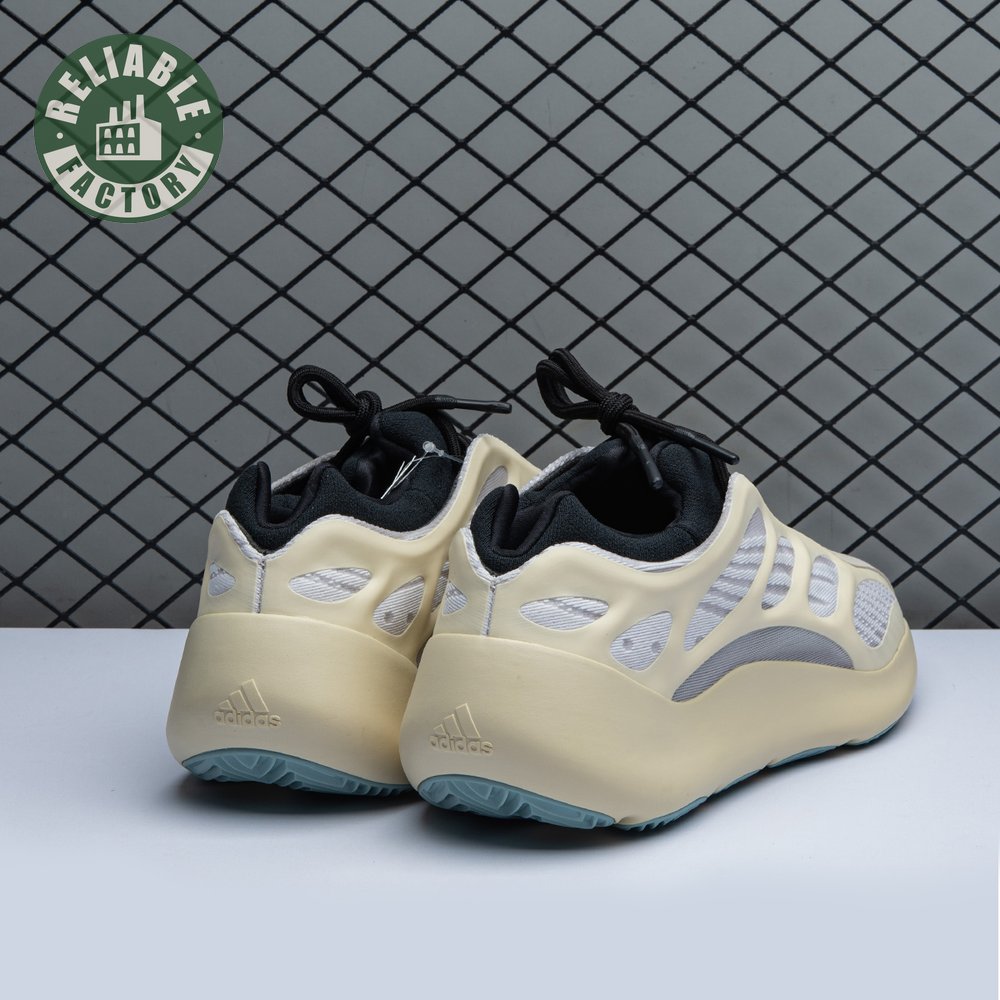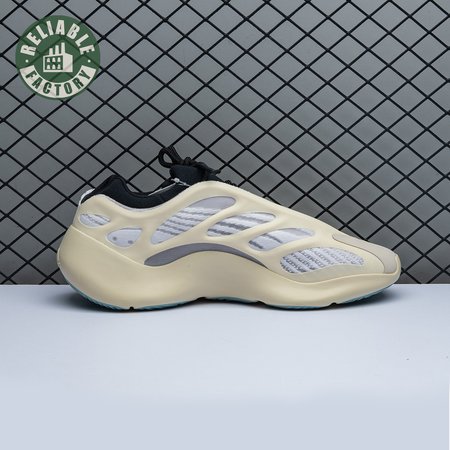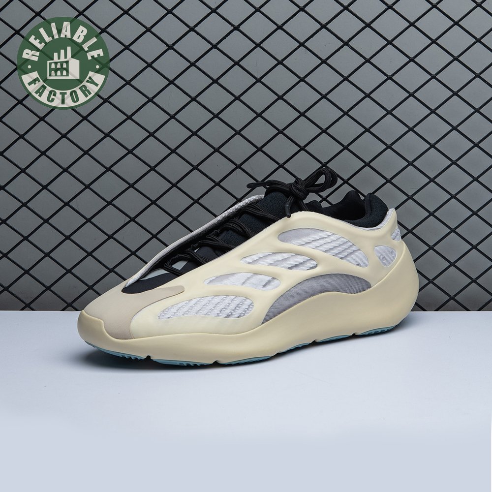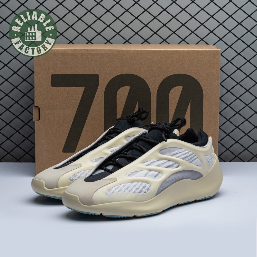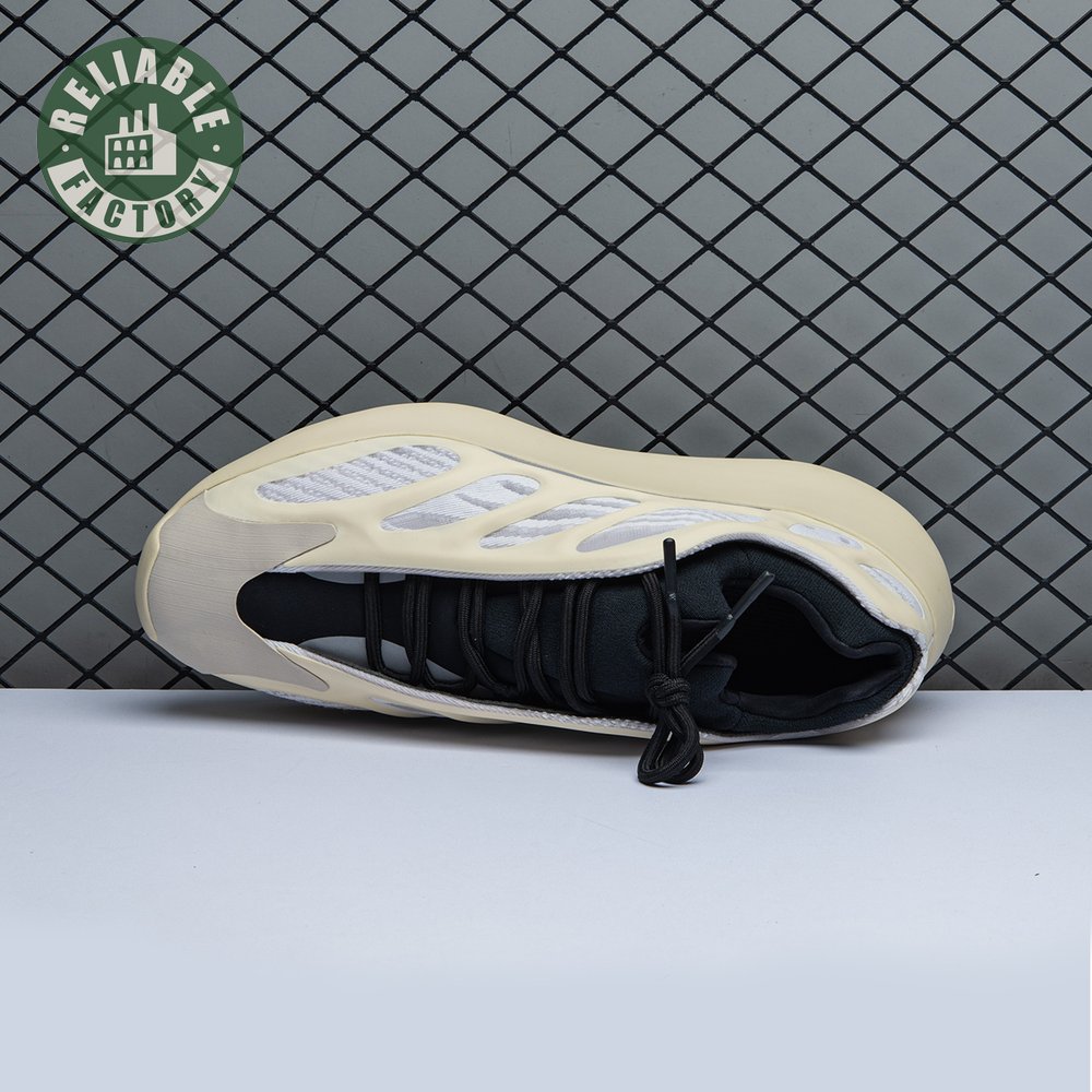 Steering away from his previous retro-inspired slant, Kanye West explores future-facing design with the adidas Yeezy 700 V3. Unveiled in December 2019, this Azael edition receives a black neoprene bootie with a notched collar and striped textile underlay encased in a sculpted, open-work cage. Integrated lacing offers traditional lockdown.