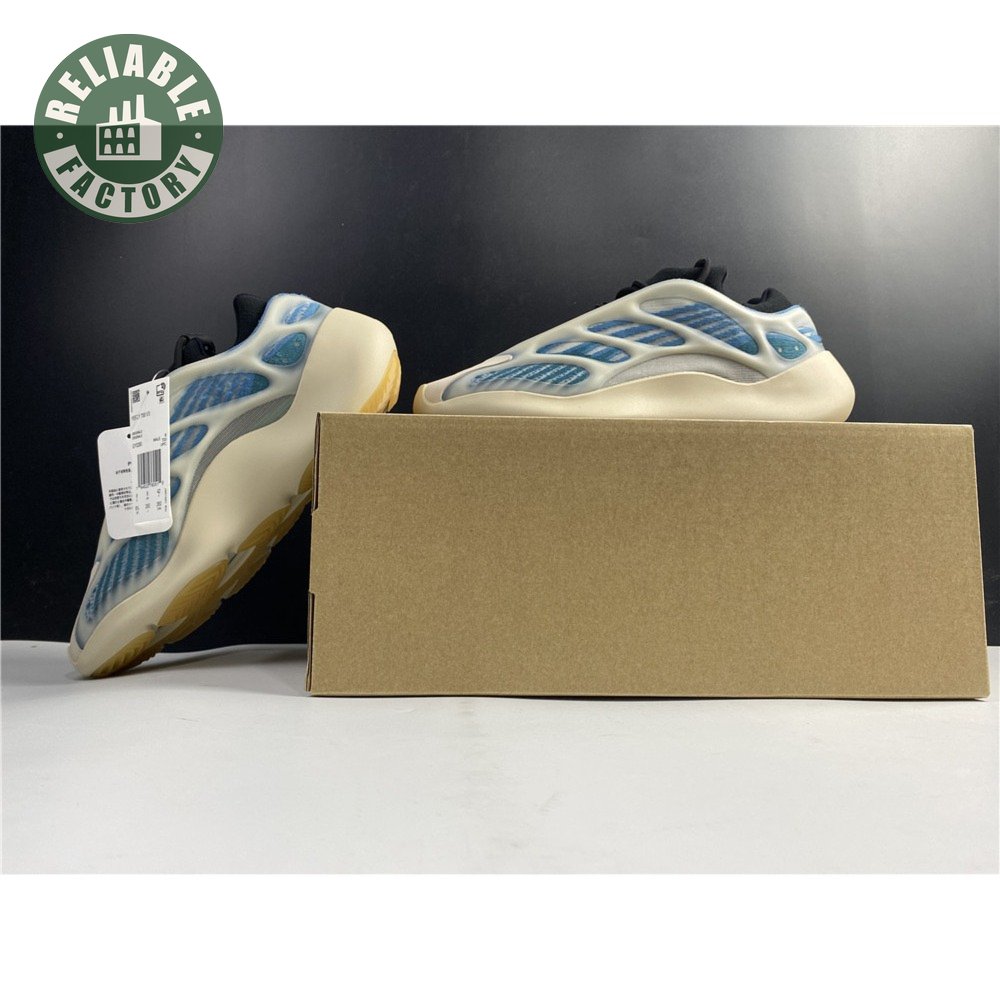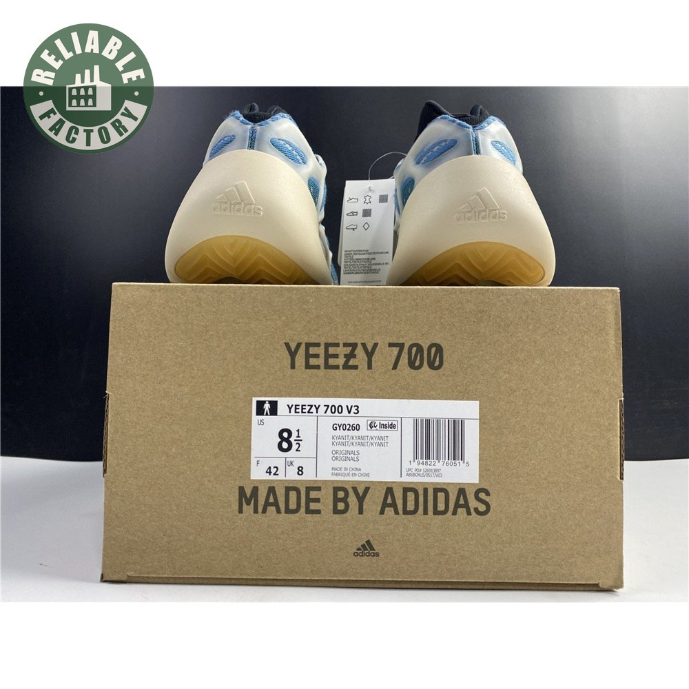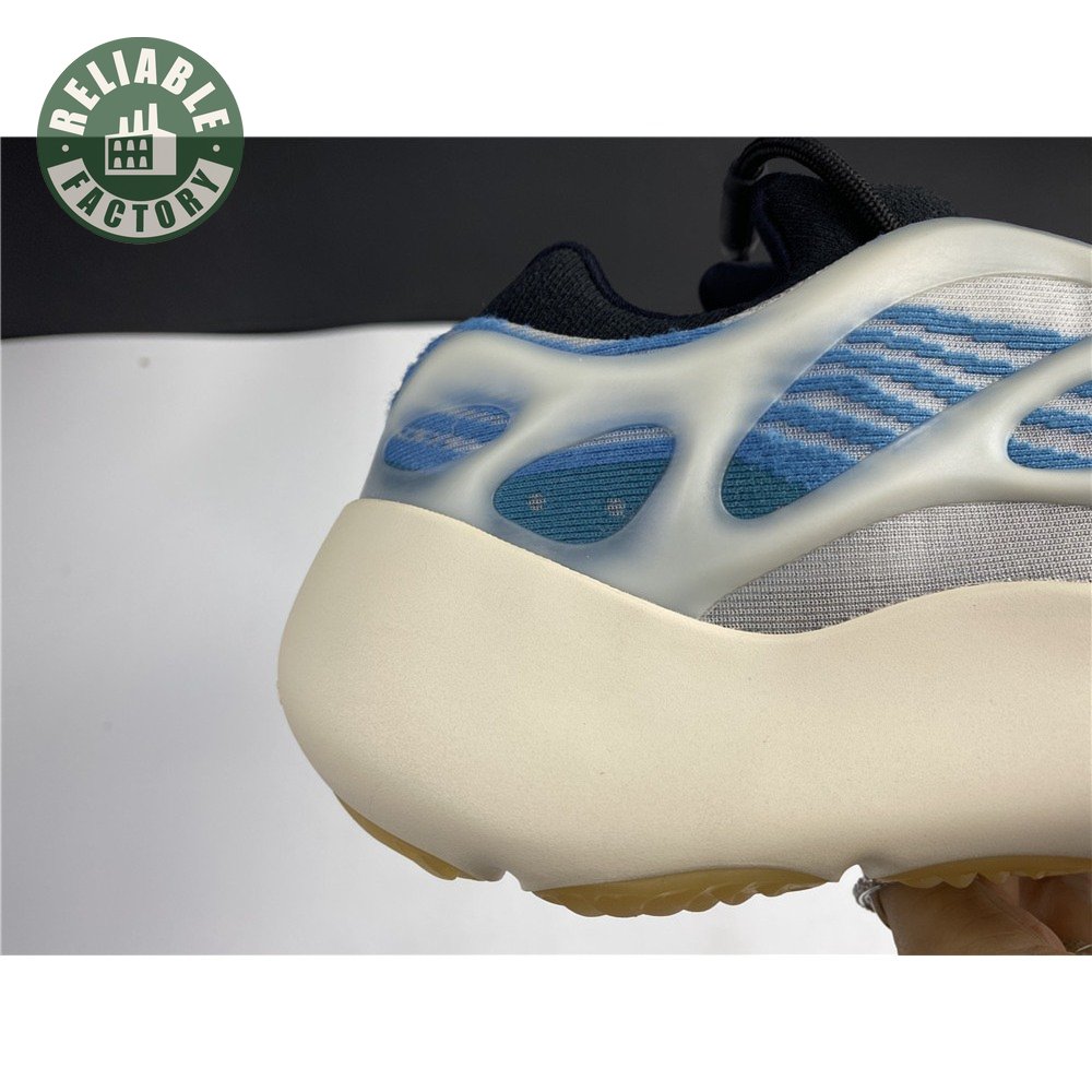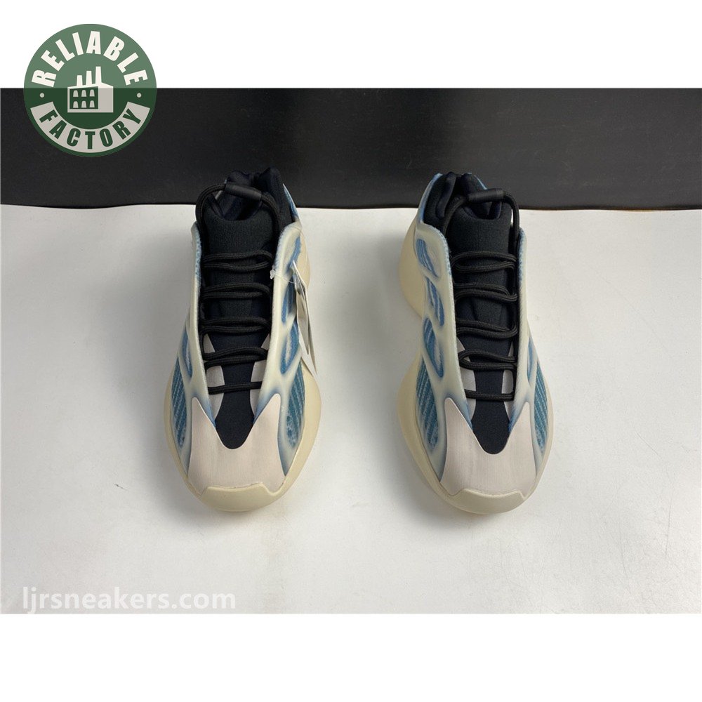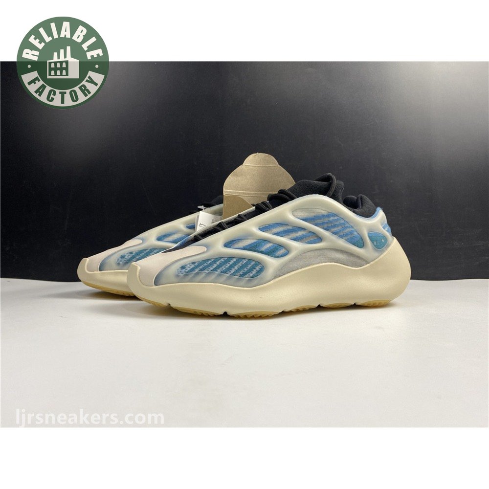 The adidas Yeezy 700 V3 "Kyanite" showcases flowing stripes of blue coloring throughout the breathable upper, constructed from monofilament engineered mesh with exoskeletal RPU overlays coated in a glow-in-the-dark finish. Interior bootie construction delivers a snug fit, while a reinforced rubber toe cap provides added durability. The sneaker rides on a lightweight EVA midsole encapsulated in an off-white PU cage, supported by a herringbone rubber outsole.