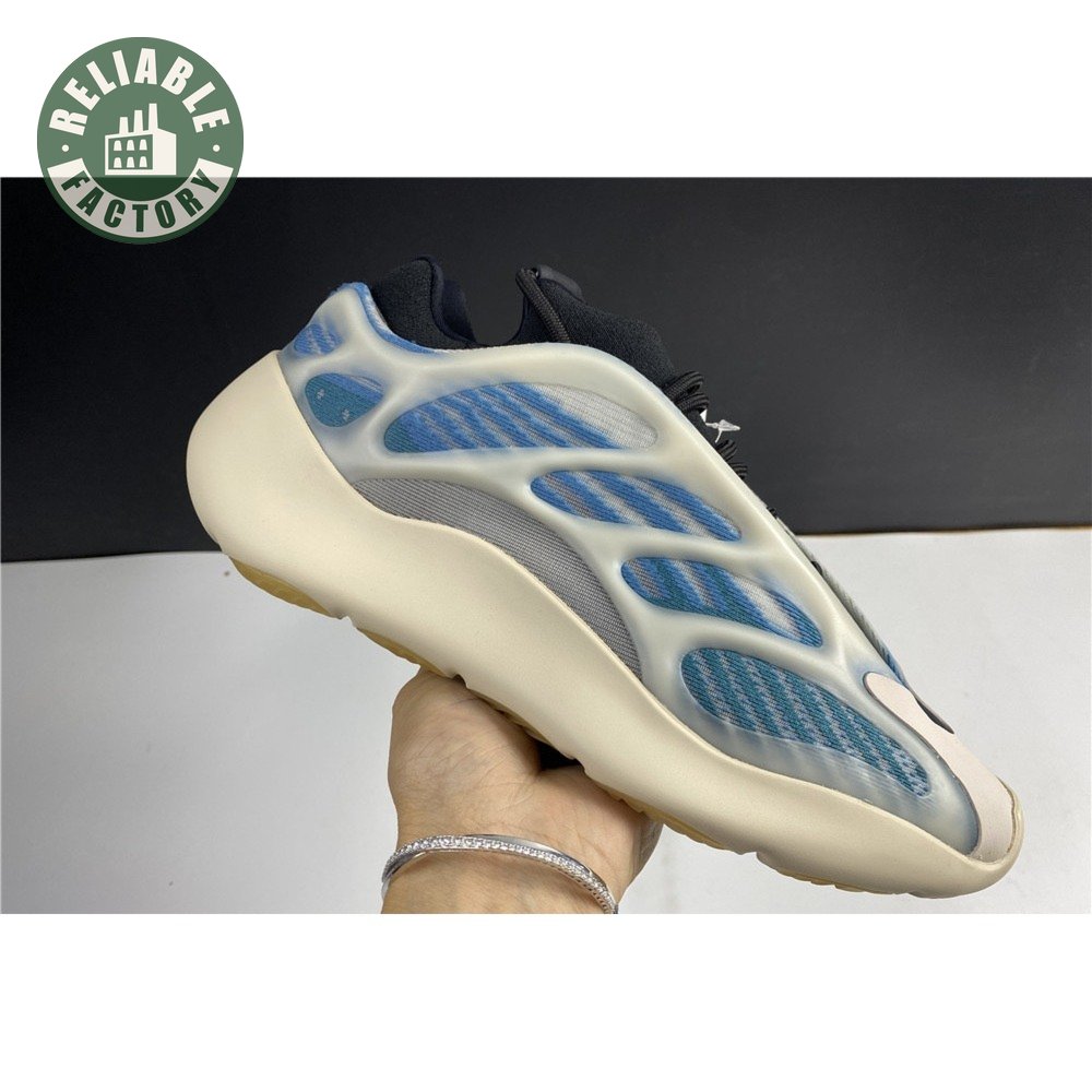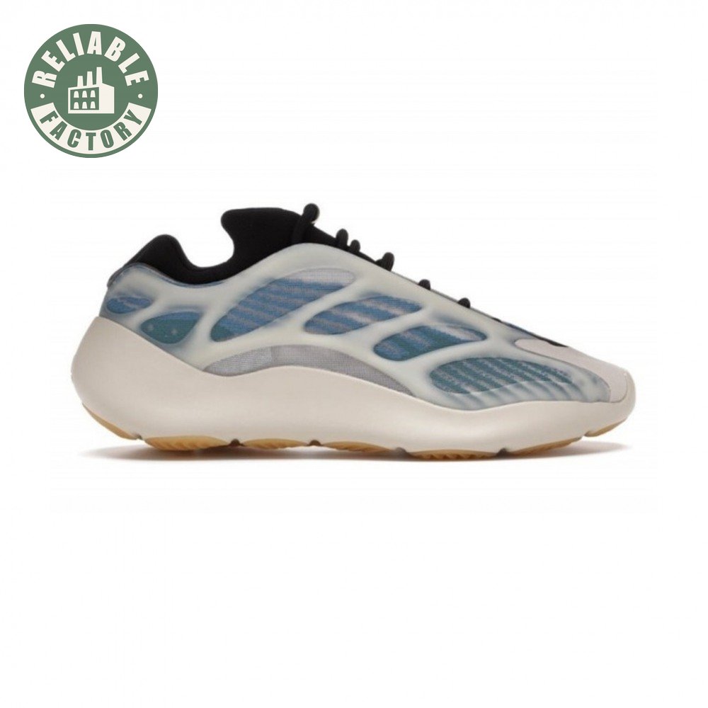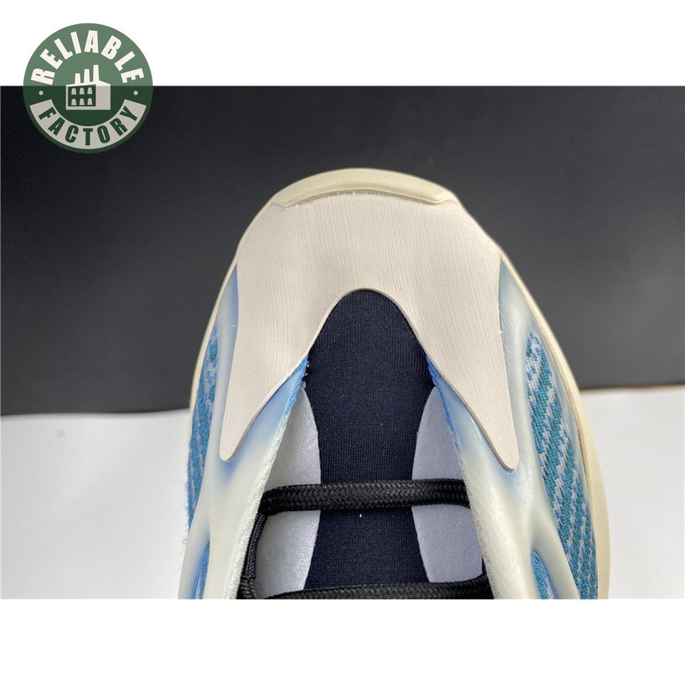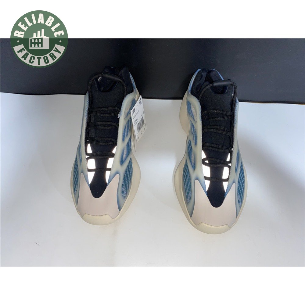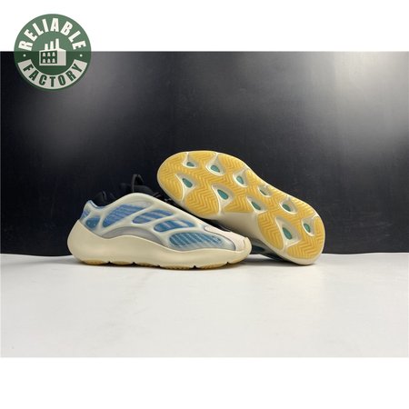 The adidas Yeezy 700 V3 "Kyanite" showcases flowing stripes of blue coloring throughout the breathable upper, constructed from monofilament engineered mesh with exoskeletal RPU overlays coated in a glow-in-the-dark finish. Interior bootie construction delivers a snug fit, while a reinforced rubber toe cap provides added durability. The sneaker rides on a lightweight EVA midsole encapsulated in an off-white PU cage, supported by a herringbone rubber outsole.