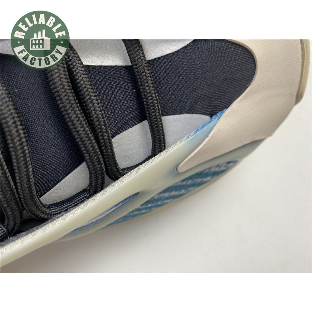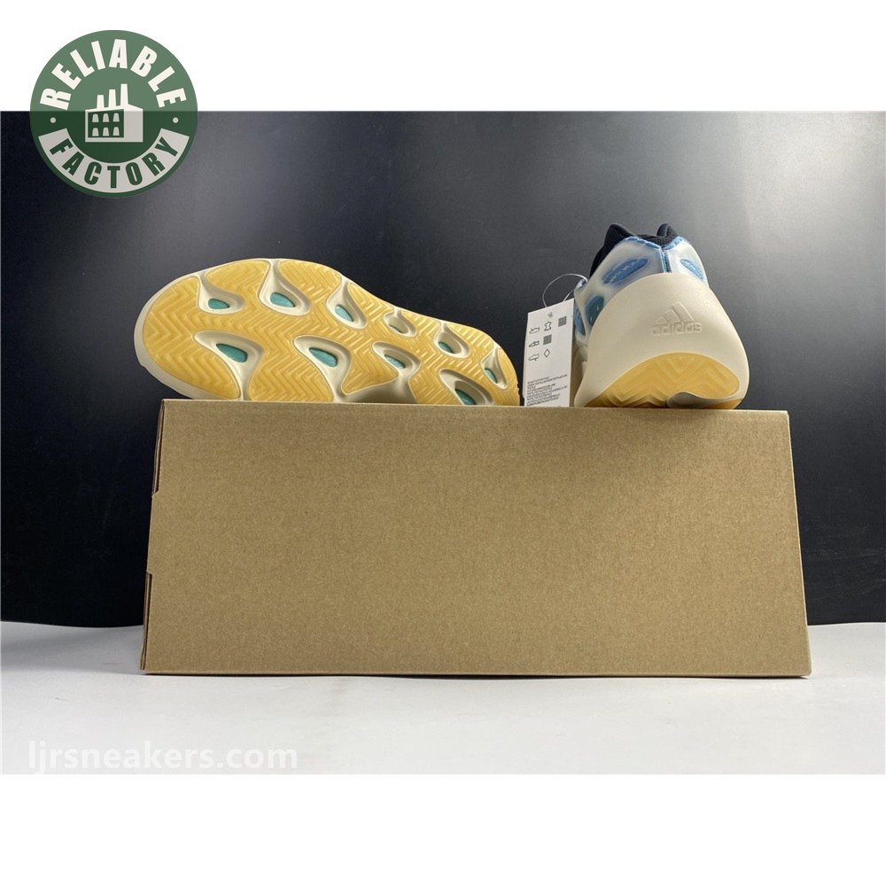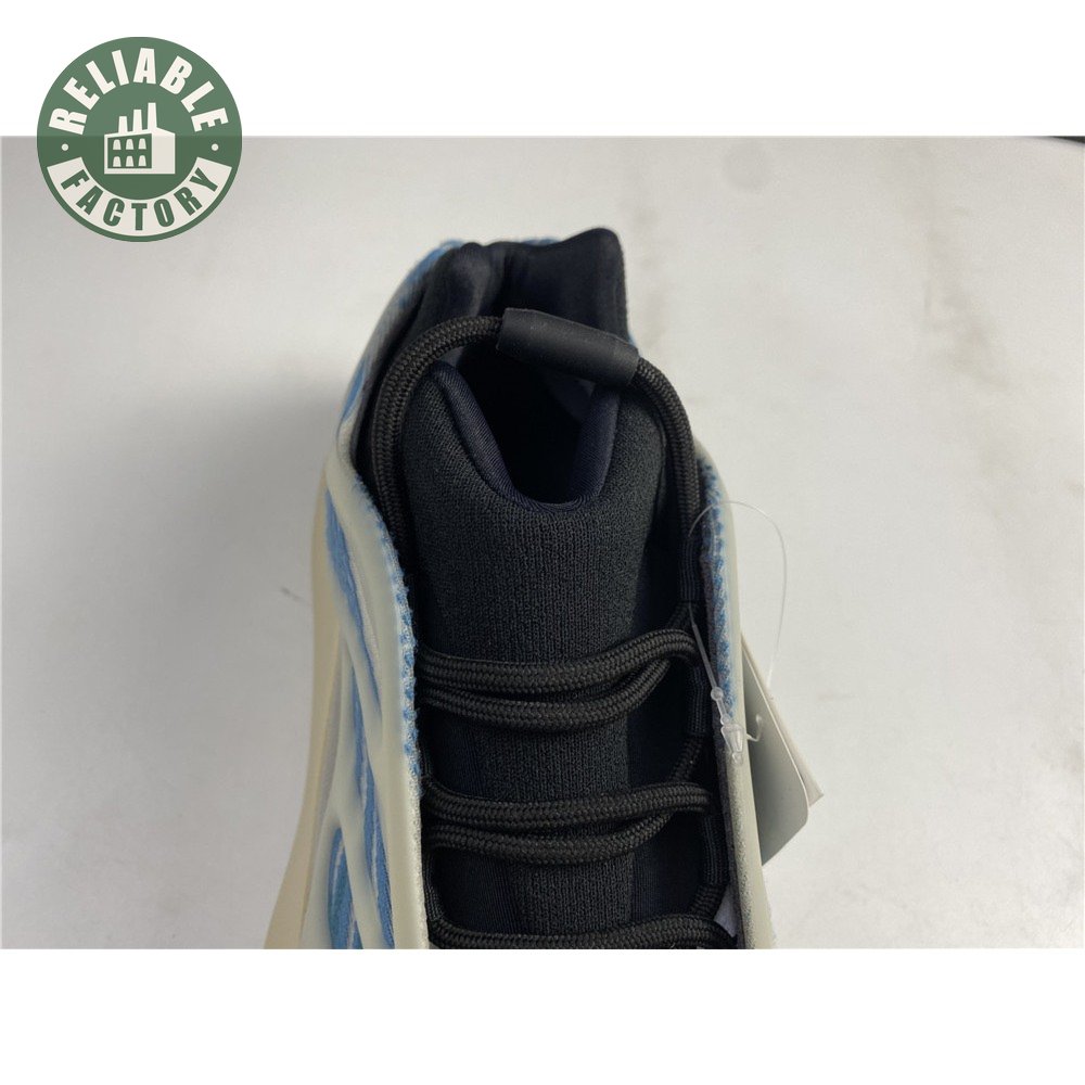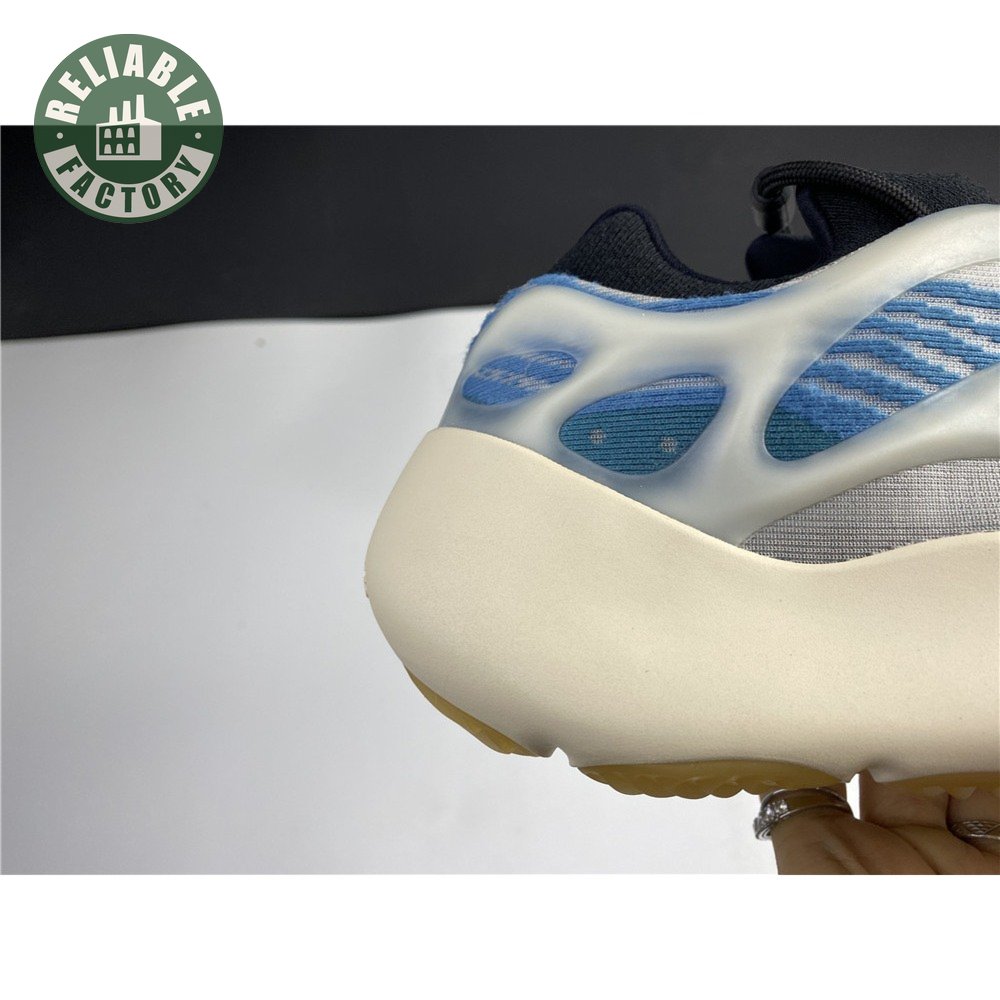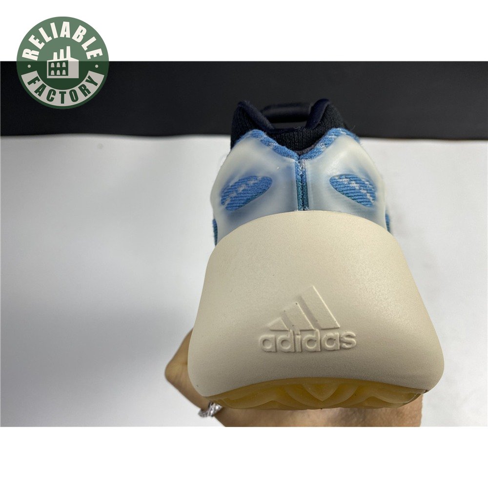 The adidas Yeezy 700 V3 "Kyanite" showcases flowing stripes of blue coloring throughout the breathable upper, constructed from monofilament engineered mesh with exoskeletal RPU overlays coated in a glow-in-the-dark finish. Interior bootie construction delivers a snug fit, while a reinforced rubber toe cap provides added durability. The sneaker rides on a lightweight EVA midsole encapsulated in an off-white PU cage, supported by a herringbone rubber outsole.