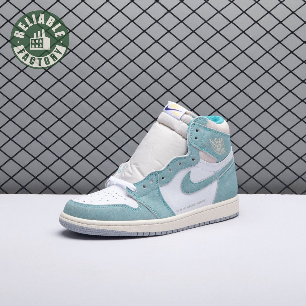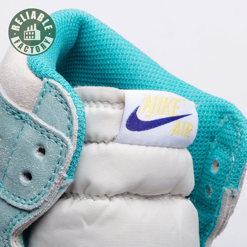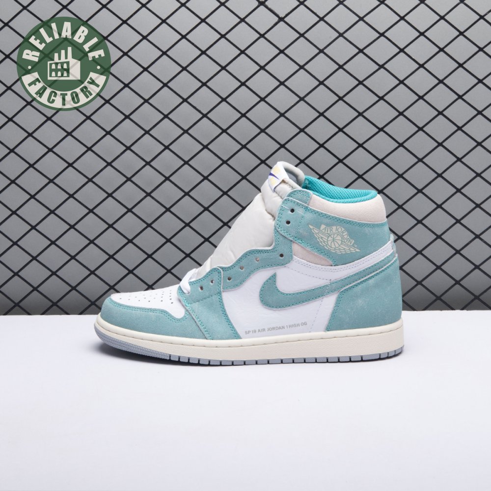 The Air Jordan 1 Retro High OG "Turbo Green" complements the silhouette"s clean lines with a classic two-tone design. A textured white leather base is contrasted by soft suede overlays in Turbo Green. The latter design element is burnished to give off a vintage aesthetic, a quality that"s further enhanced by a midsole finished in Off-White Sail. In addition to a woven Nike Air tongue tag in purple and yellow, exterior branding also includes a line of text at the base of the quarter panel that reads "SP 19 Air Jordan 1 High OG."