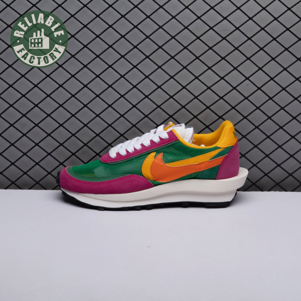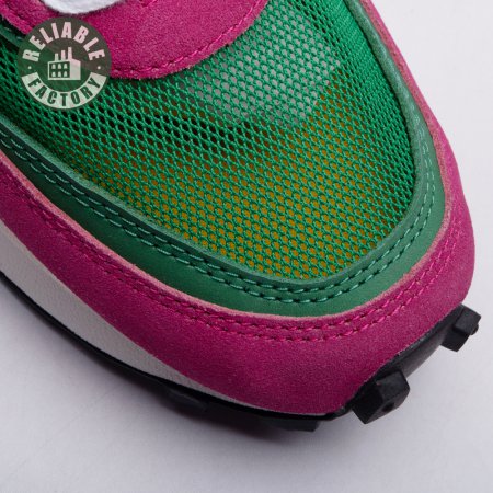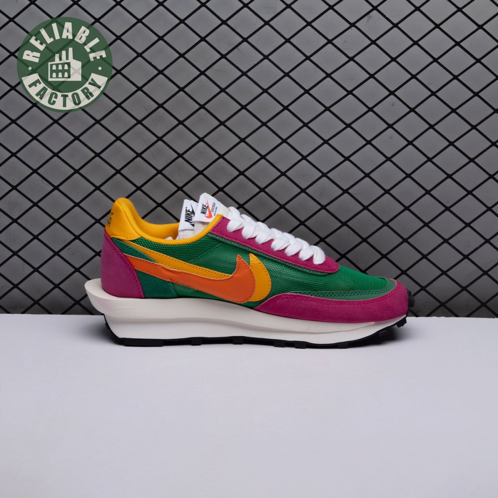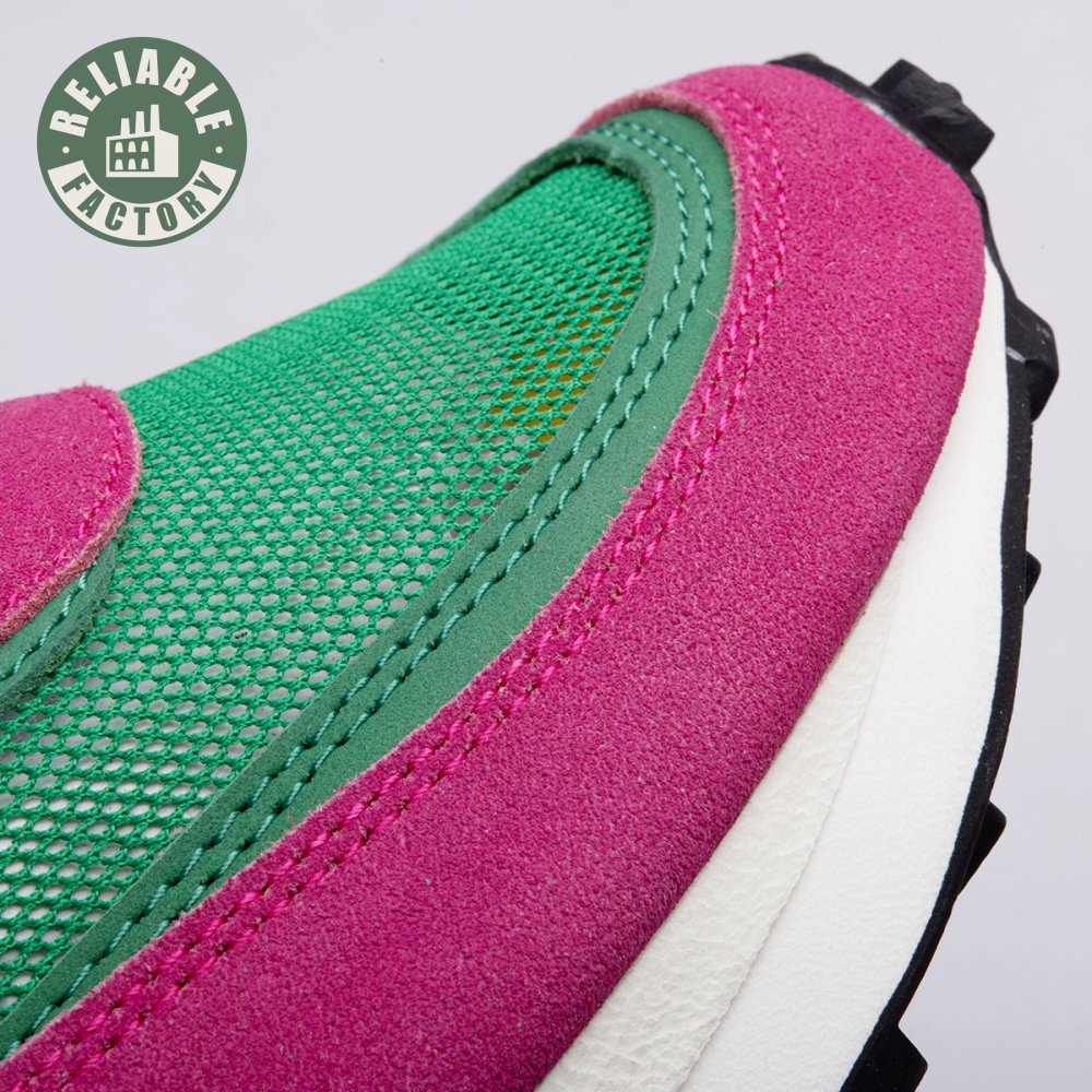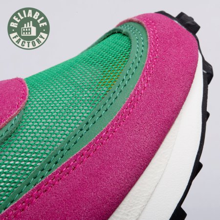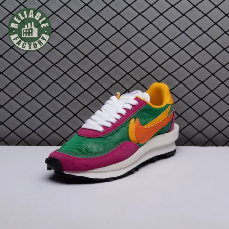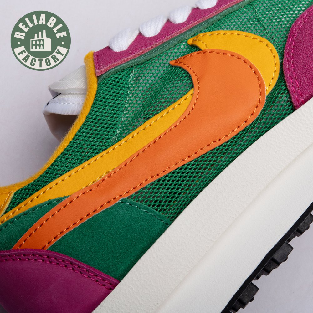 The Sacai x LDWaffle fuses the Japanese label's experimentalism with Nike's heritage ingenuity. Unveiled in September 2019, this 'Pine Green' edition updates the hybrid model in a vibrant color story. Its mesh upper sees layered suede eyestays, double reinforcements and dual, two-tone Swooshes. The aesthetic is furthered by twin tongues, optional double laces and stacked heel logos. Its double stacked, sculpted midsole follows the same formula atop a rubber waffle tread.