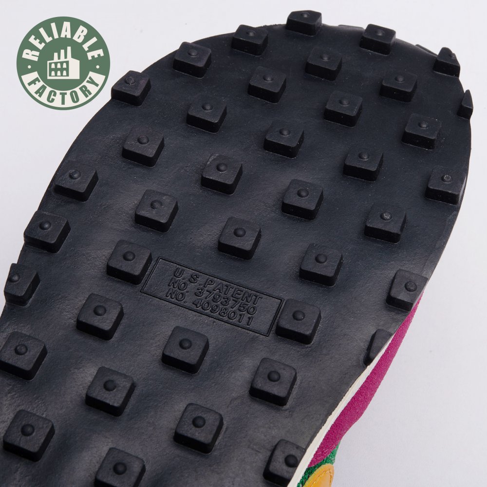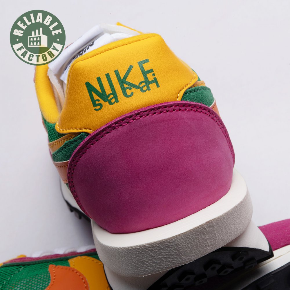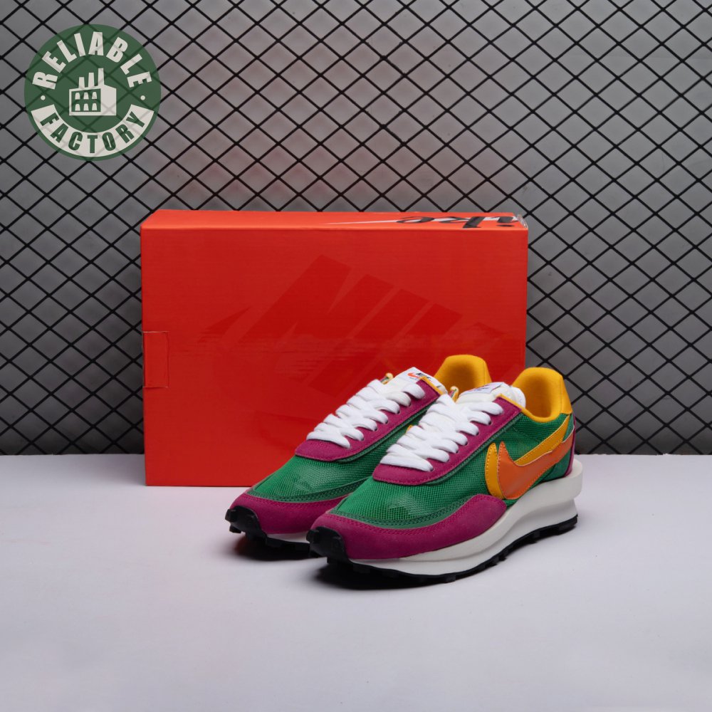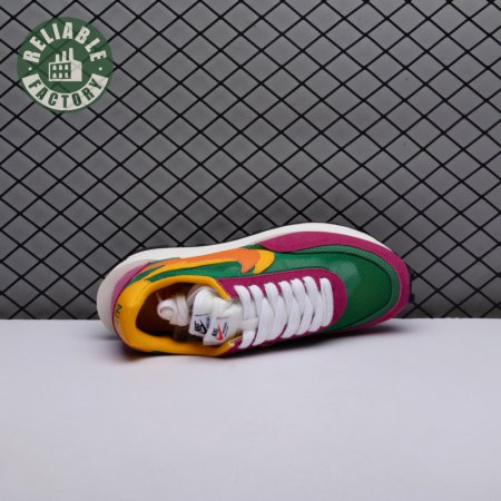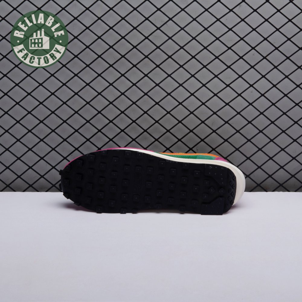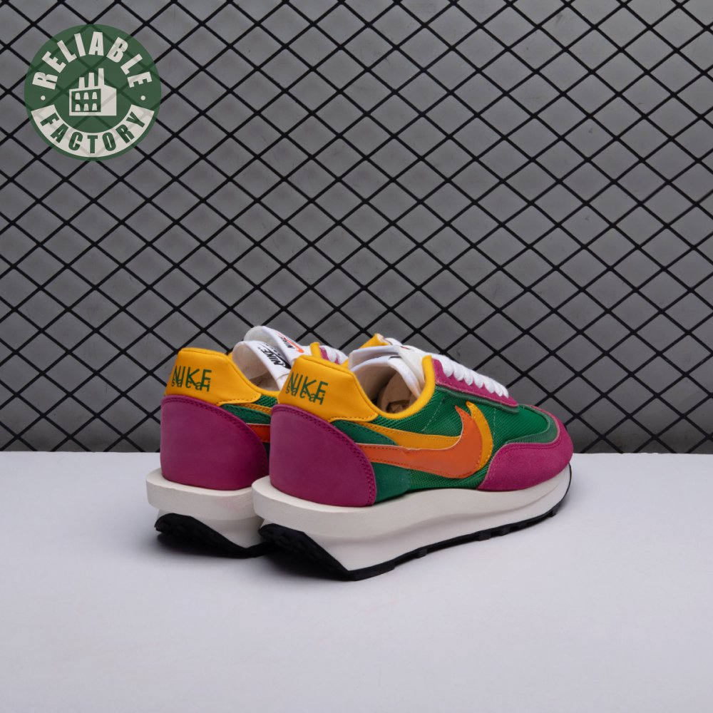 The Sacai x LDWaffle fuses the Japanese label's experimentalism with Nike's heritage ingenuity. Unveiled in September 2019, this 'Pine Green' edition updates the hybrid model in a vibrant color story. Its mesh upper sees layered suede eyestays, double reinforcements and dual, two-tone Swooshes. The aesthetic is furthered by twin tongues, optional double laces and stacked heel logos. Its double stacked, sculpted midsole follows the same formula atop a rubber waffle tread.