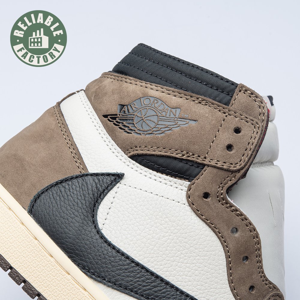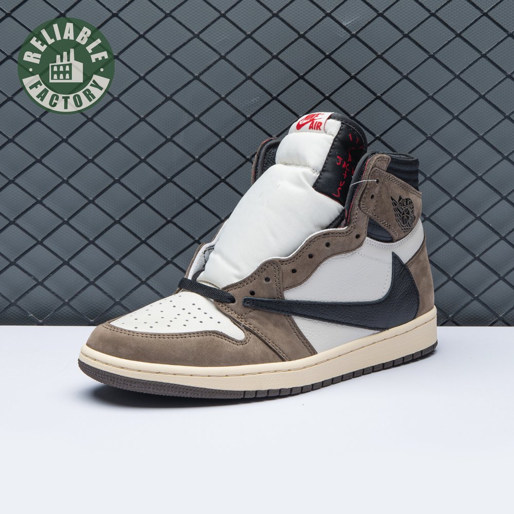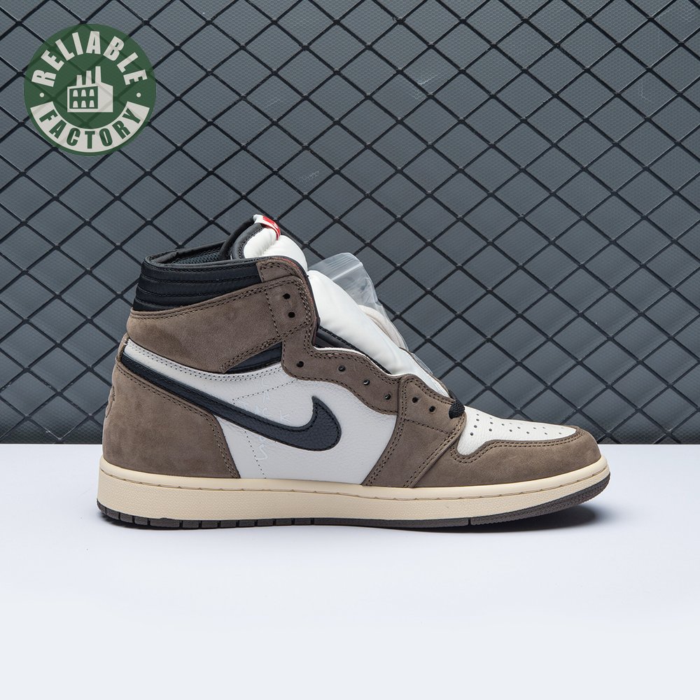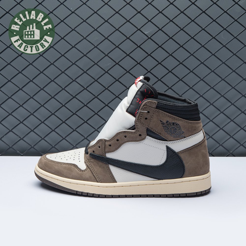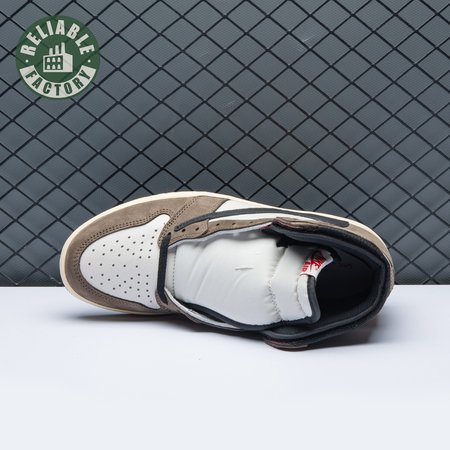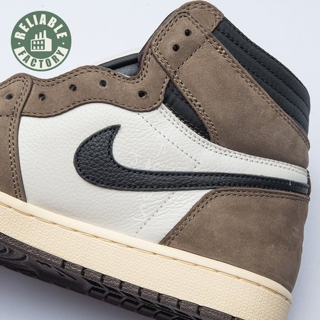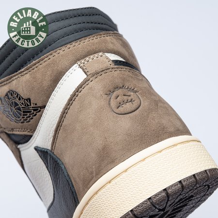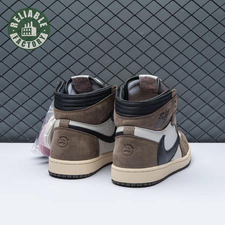 The Travis Scott x Air Jordan 1 Retro High features a new look on the iconic silhouette, thanks to an oversized backward-facing Swoosh on the lateral side. A traditionally oriented Swoosh graces the medial side of the upper, which is built with a blend of white leather and brown suede. Additional unique details include a double-layer construction on the collar and Scott"s crudely drawn face logo embossed on the heel.