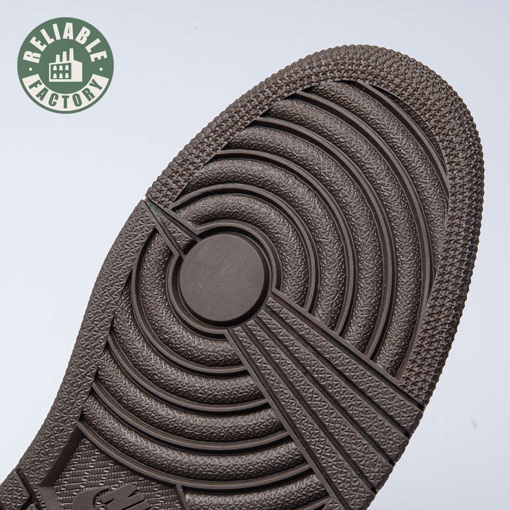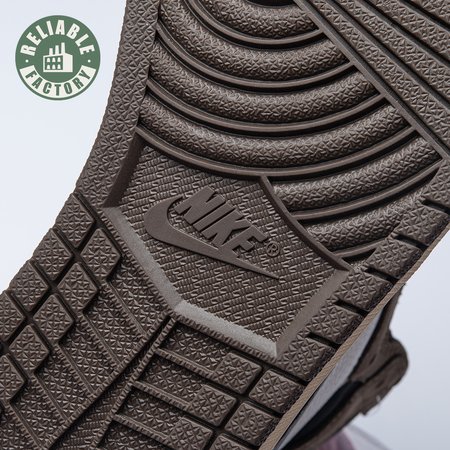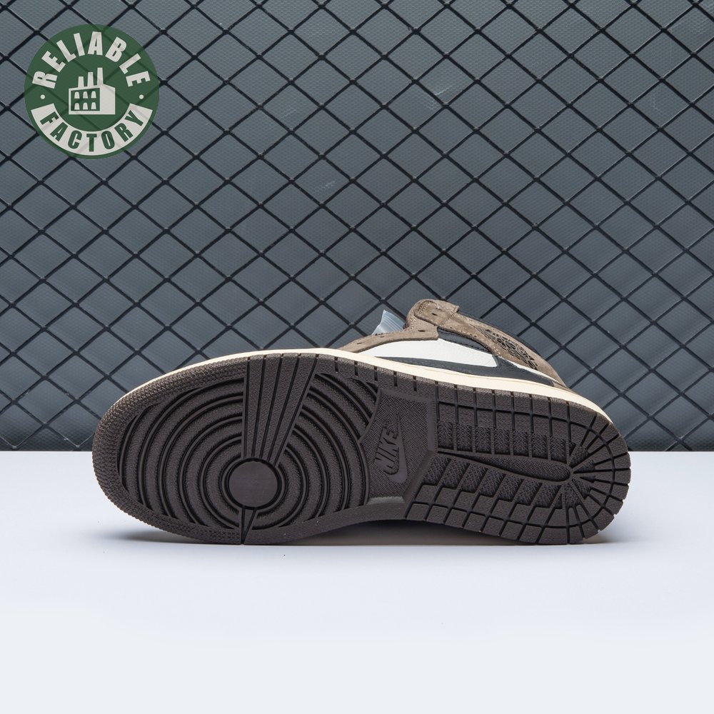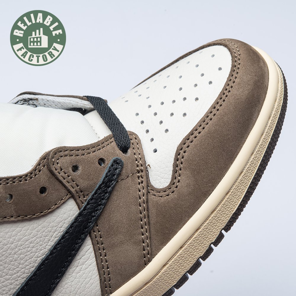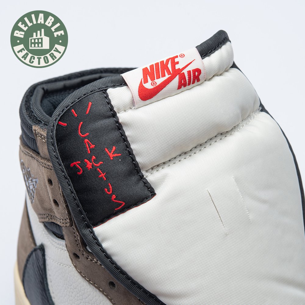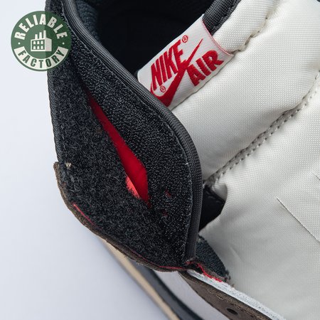 The Travis Scott x Air Jordan 1 Retro High features a new look on the iconic silhouette, thanks to an oversized backward-facing Swoosh on the lateral side. A traditionally oriented Swoosh graces the medial side of the upper, which is built with a blend of white leather and brown suede. Additional unique details include a double-layer construction on the collar and Scott"s crudely drawn face logo embossed on the heel.