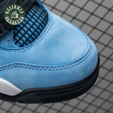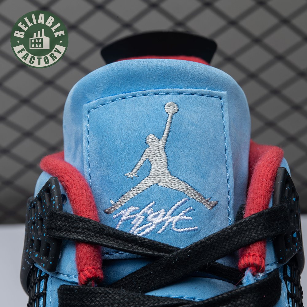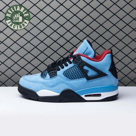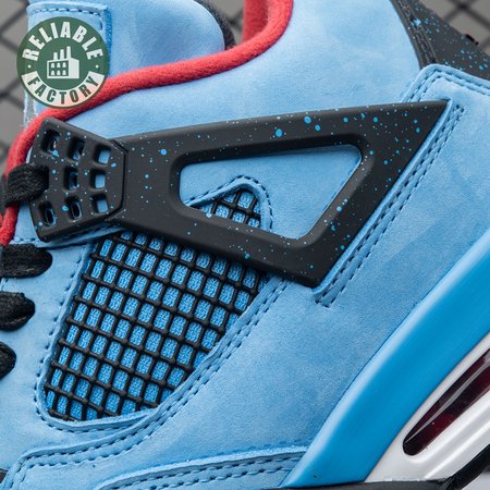 Music artist Travis Scott hails from Houston, where the Oilers used to take the field in red, white and blue uniforms. The Travis Scott x Air Jordan 4 Retro 'Cactus Jack' colorway pays tribute to the city"s bygone football team with a Durabuck leather upper dressed in University Blue and a Varsity Red insole. The black lace cage and a heel panel feature a light blue speckle pattern. Cactus Jack branding appears on the left heel in Varsity Red, with a matching Jumpman logo on the right.