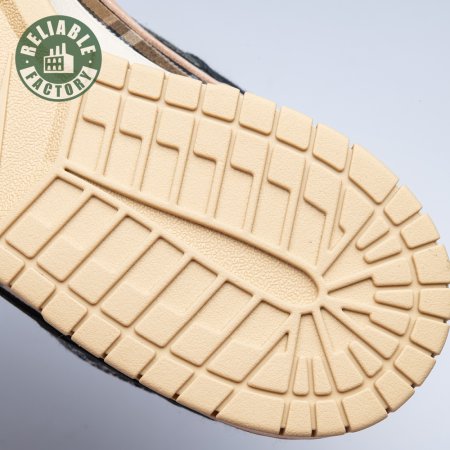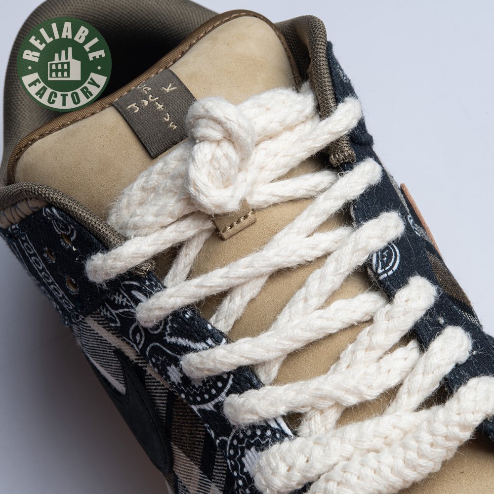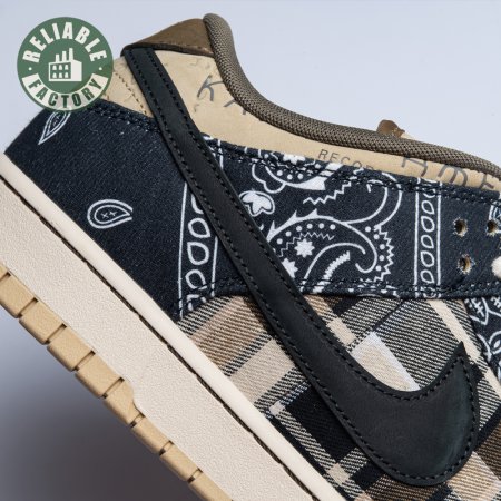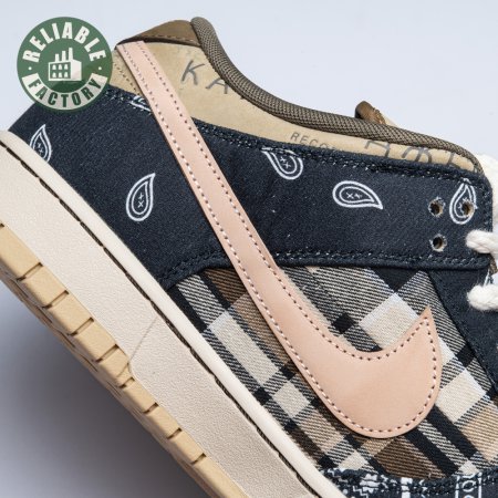 The Travis Scott x Dunk Low SB shows off a unique patchwork motif on the upper, featuring a tan leather base with plaid quarter panels and paisley print overlays, the latter made to tear away to reveal hidden elephant print underneath. The dueling patterns are complemented by rope laces, Cactus Jack tongue tags and mismatched black and pink Swooshes on each shoe. A white midsole and tan rubber outsole anchor the complex design.