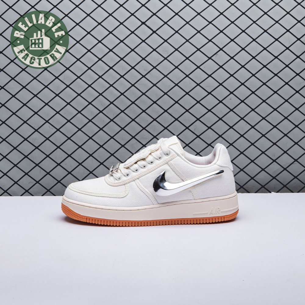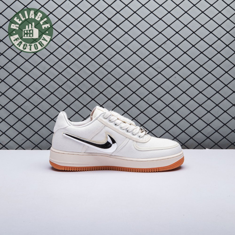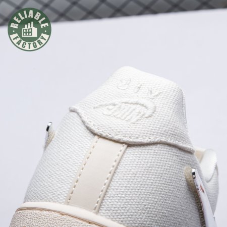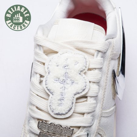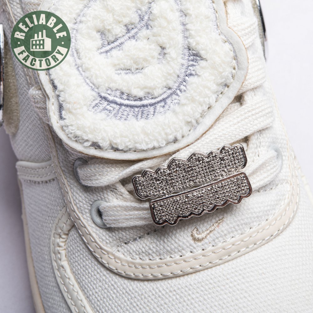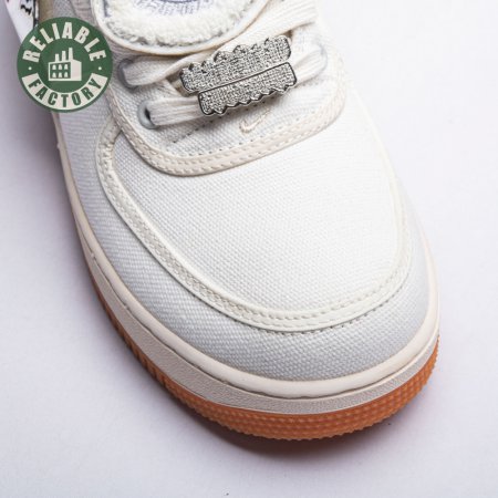The "Sail" colorway of Travis Scott"s Air Force 1 represents the Houston rapper"s second collaboration with Nike on the classic silhouette. Aside from swapping out the all-white finish of its predecessor with slightly darker Sail, the new model is mostly unchanged. Tonal canvas construction is accented with removable Swooshes and tongue patches, while the shiny lace jewels give a nod to Scott"s signature grill.