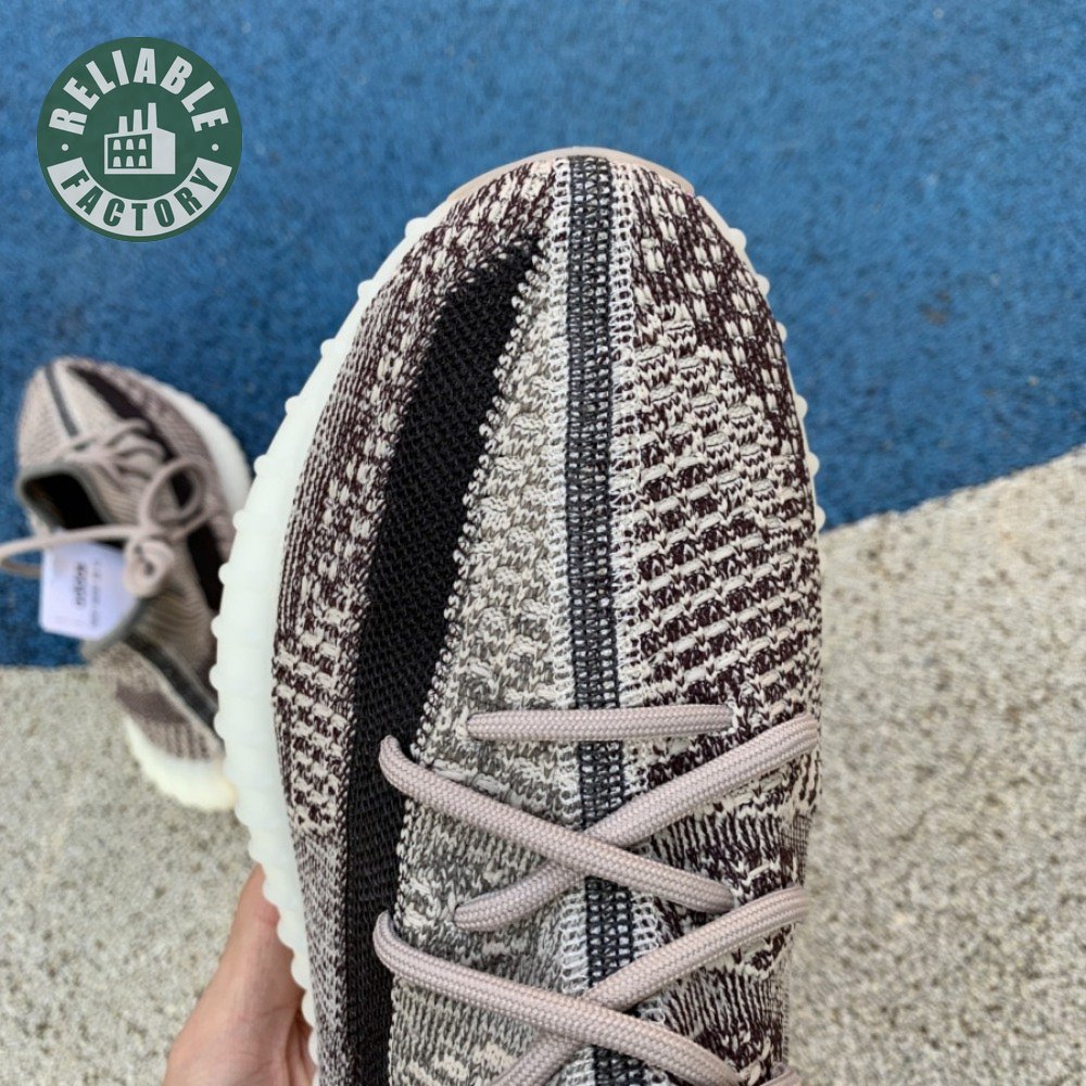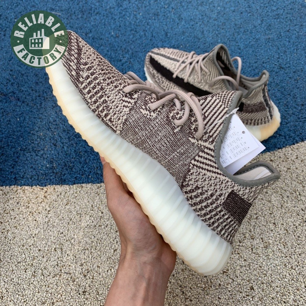 The adidas Yeezy Boost 350 V2 "Zyon" showcases various woven patterns on the breathable Primeknit upper, executed in a subdued blend of earth tones. The collar is trimmed in neutral grey, while the signature post-dyed monofilament stripe cuts through the sneaker"s lateral side in a dark brown finish. Full-length Boost cushioning is visible through the semi-translucent rubber midsole, reinforced underfoot by a gum rubber outsole.
