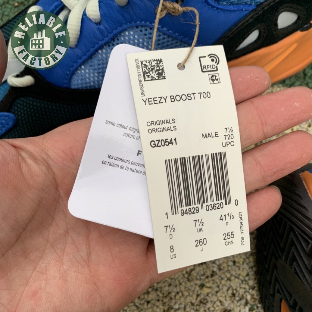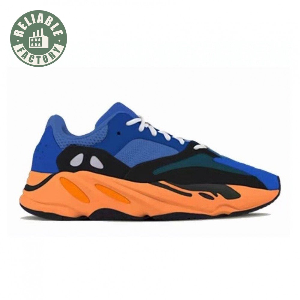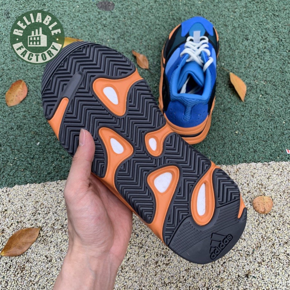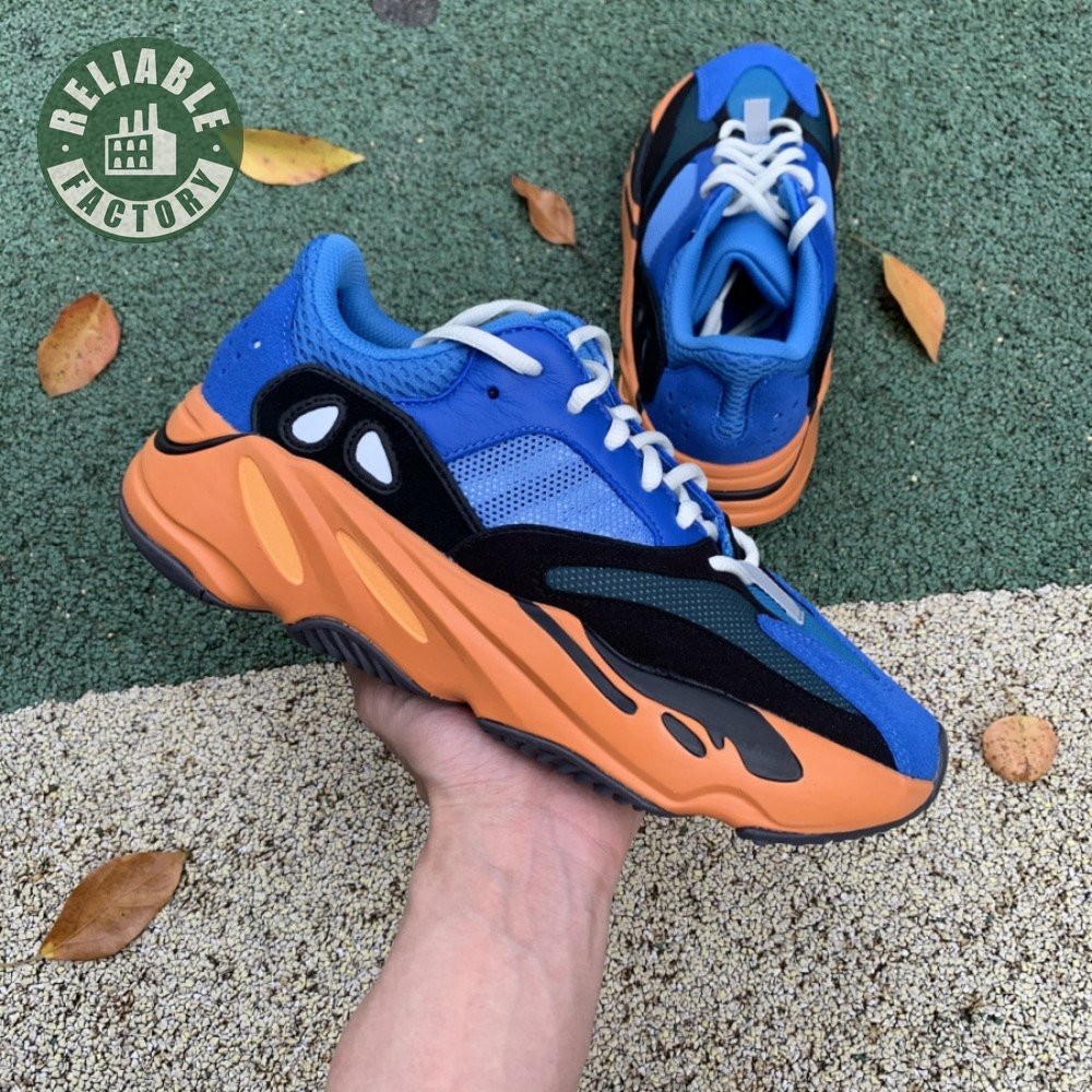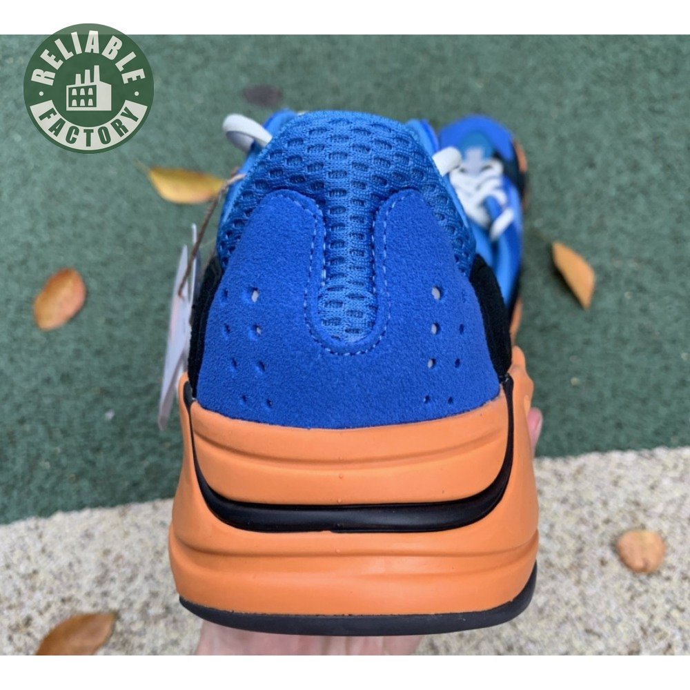 The adidas Yeezy Boost 700 "Bright Blue" uses sharply contrasting finishes to delineate the lifestyle runner"s upper and tooling. The latter pairs sculpted orange sidewalls with a contrasting black rubber outsole, featuring a herringbone traction pattern with cut-out detailing that reveals a drop-in Boost midsole. Up top, royal blue mesh is reinforced with tonal suede overlays at the toe and heel, along with black suede midfoot panels enlivened with reflective detailing.