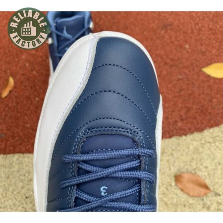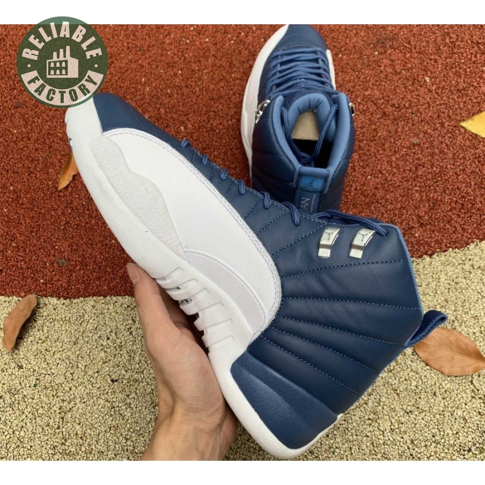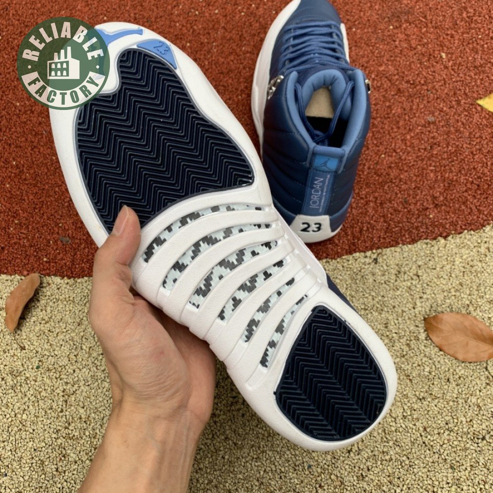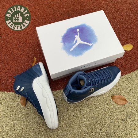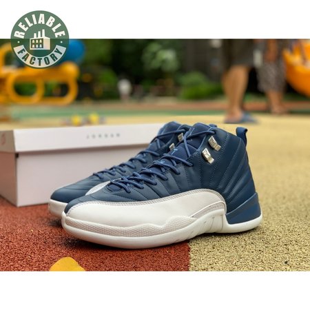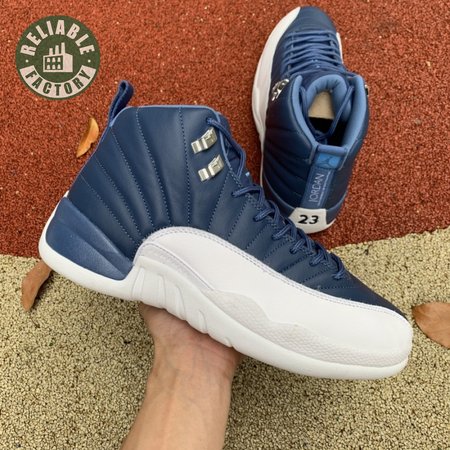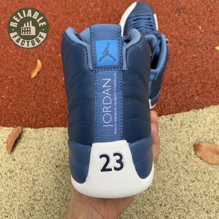The Air Jordan 12 Retro "Indigo" delivers a simple two-tone colorway of the classic silhouette. The upper makes use of stitched leather in a straightforward indigo hue, accented with a smooth leather mudguard in white. A lighter shade of Legend Blue appears on the heel tab and embroidered Jumpman atop the tongue. The silhouette"s subtle lizard texture is limited to the midsole, reinforced by a herringbone rubber outsole and a carbon fiber shank.