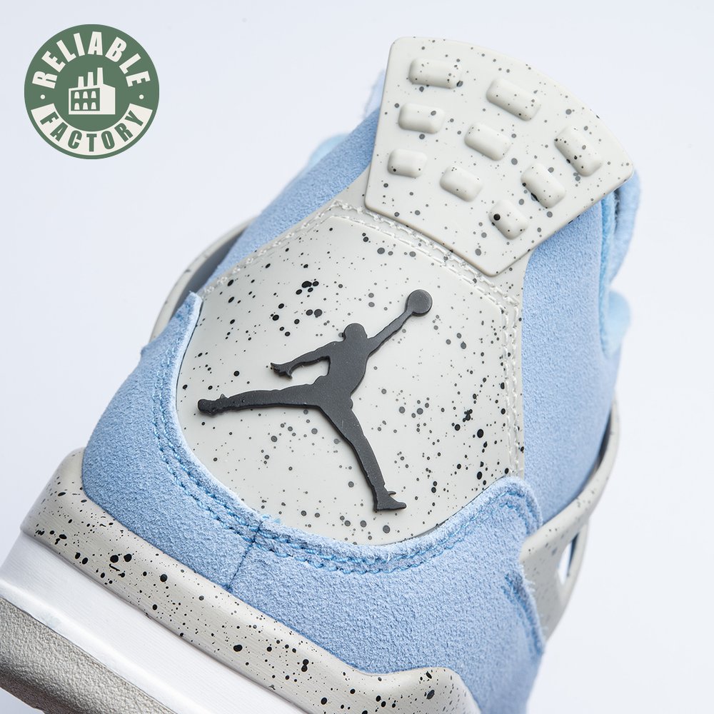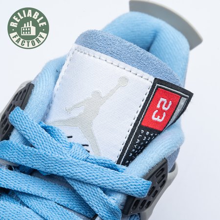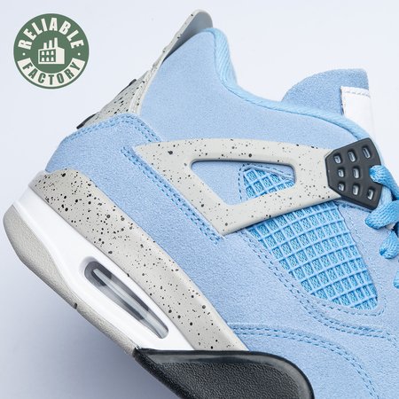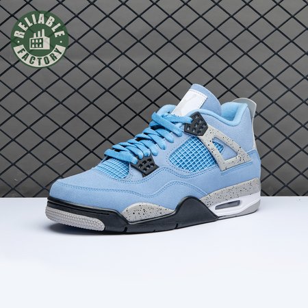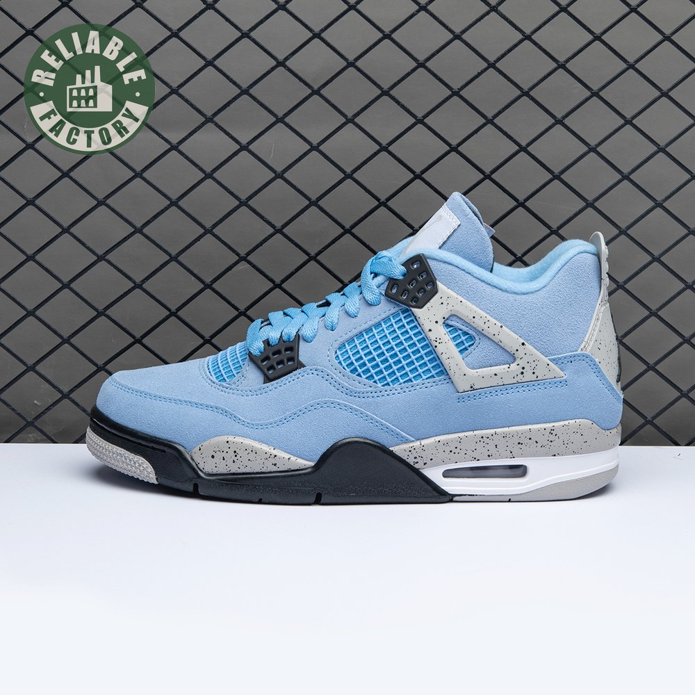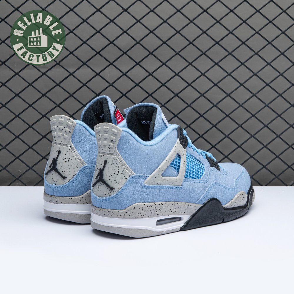 The Air Jordan 4 Retro "University Blue" updates the classic silhouette with a suede upper in a familiar hue inspired by Michael Jordan"s UNC alma mater. The bright blue palette is contrasted by a speckled grey finish on the sneaker"s supportive wings and back heel, featuring a raised Jumpman icon in black. Secondary Jumpman branding adorns the woven tongue tag, designed to mimic a jock tag that typically appears on the bottom hem of Jordan jerseys.