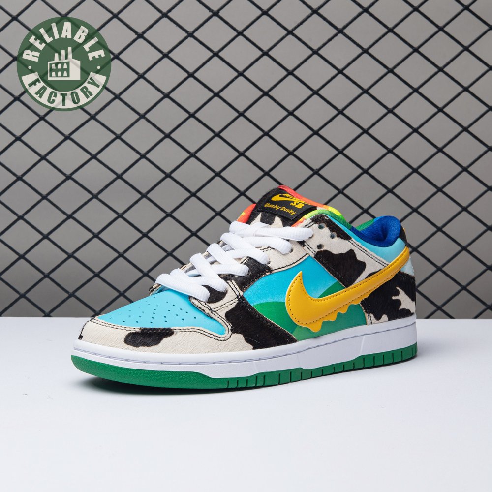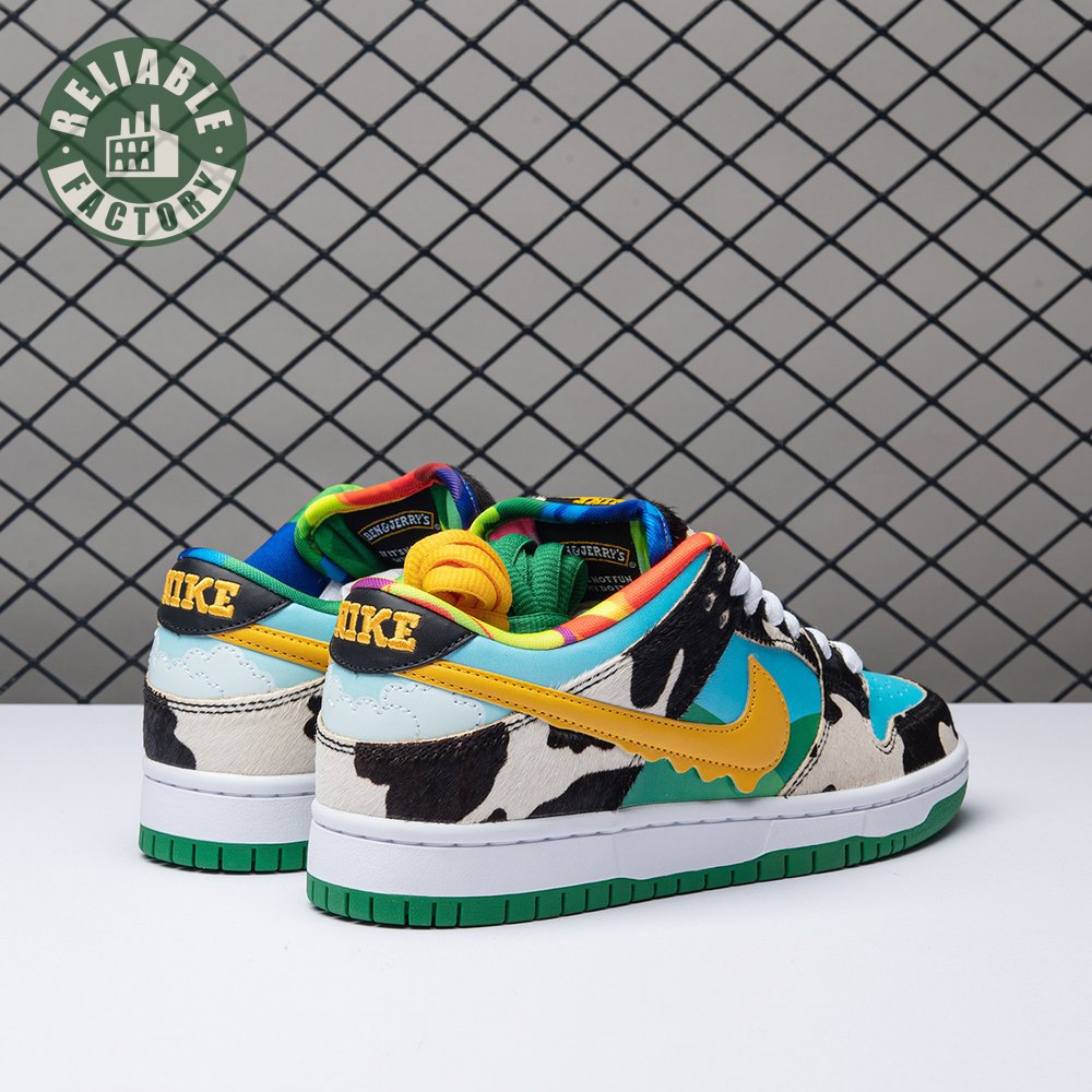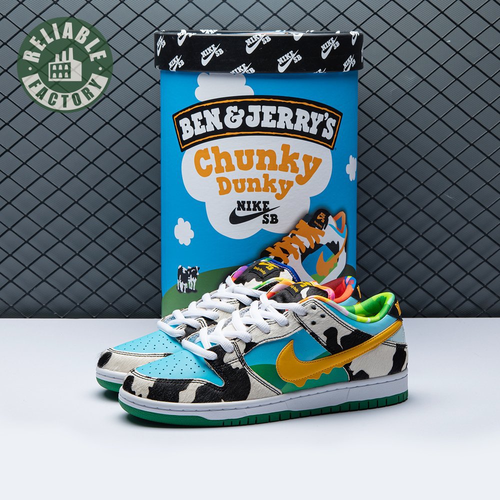 Made in collaboration with Ben & Jerry"s, the Nike Dunk Low SB "Chunky Dunky" replicates the packaging used for the ice cream brand"s Chunky Monkey flavor. The leather upper depicts blue skies and green pastures, while pony-hair overlays are rendered in a spotted cow print. A yellow leather Swoosh is treated to a melting ice cream effect for added visual flair. Atop the tongue, the woven tag features a Chunky Dunky callout alongside Nike SB branding.