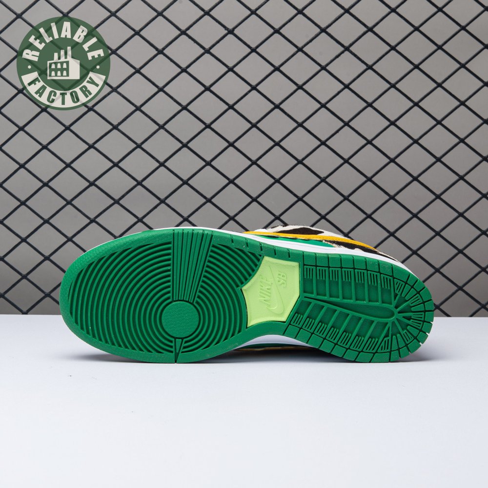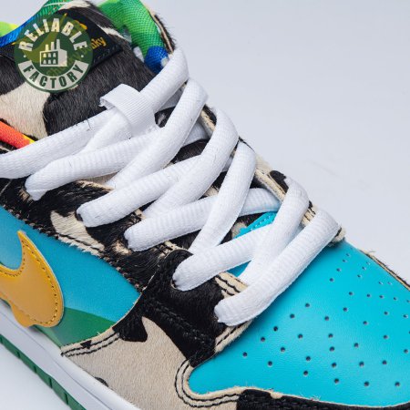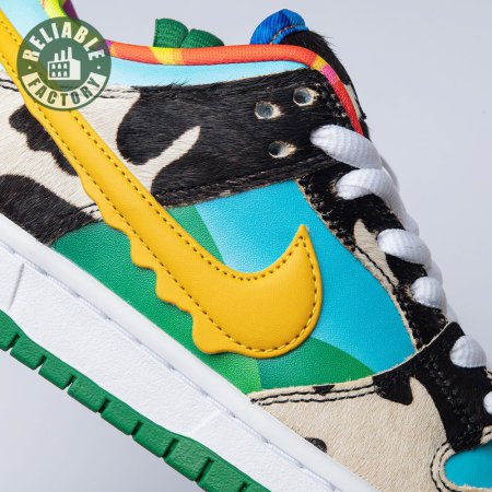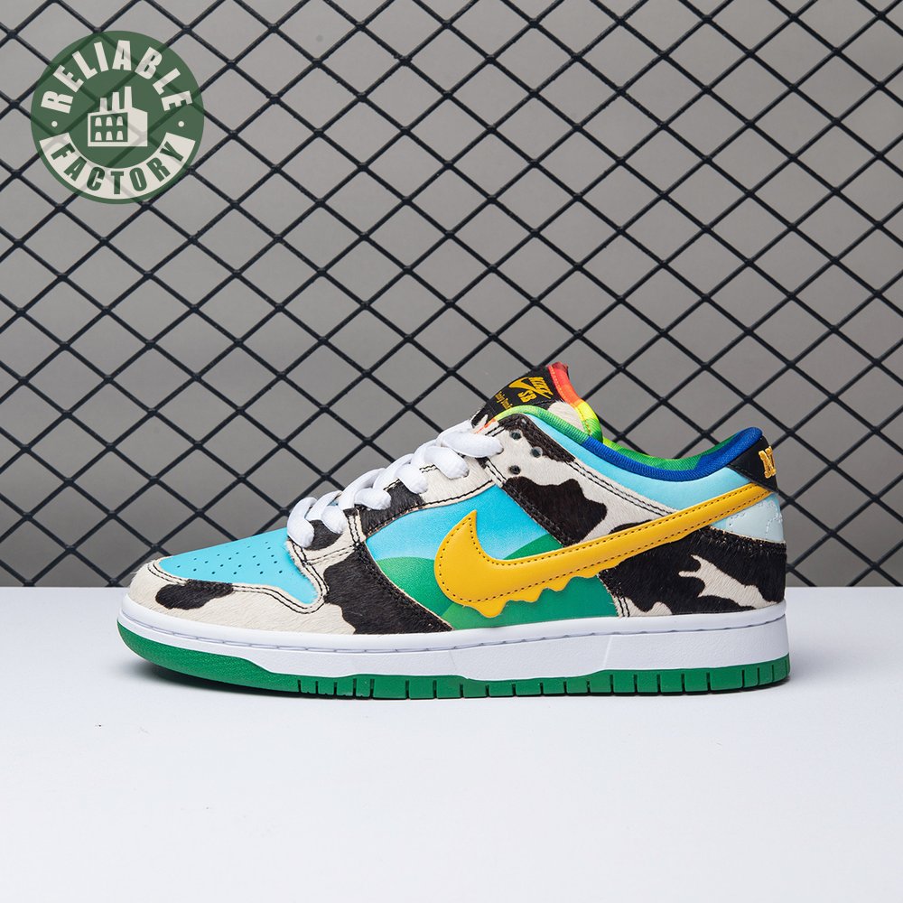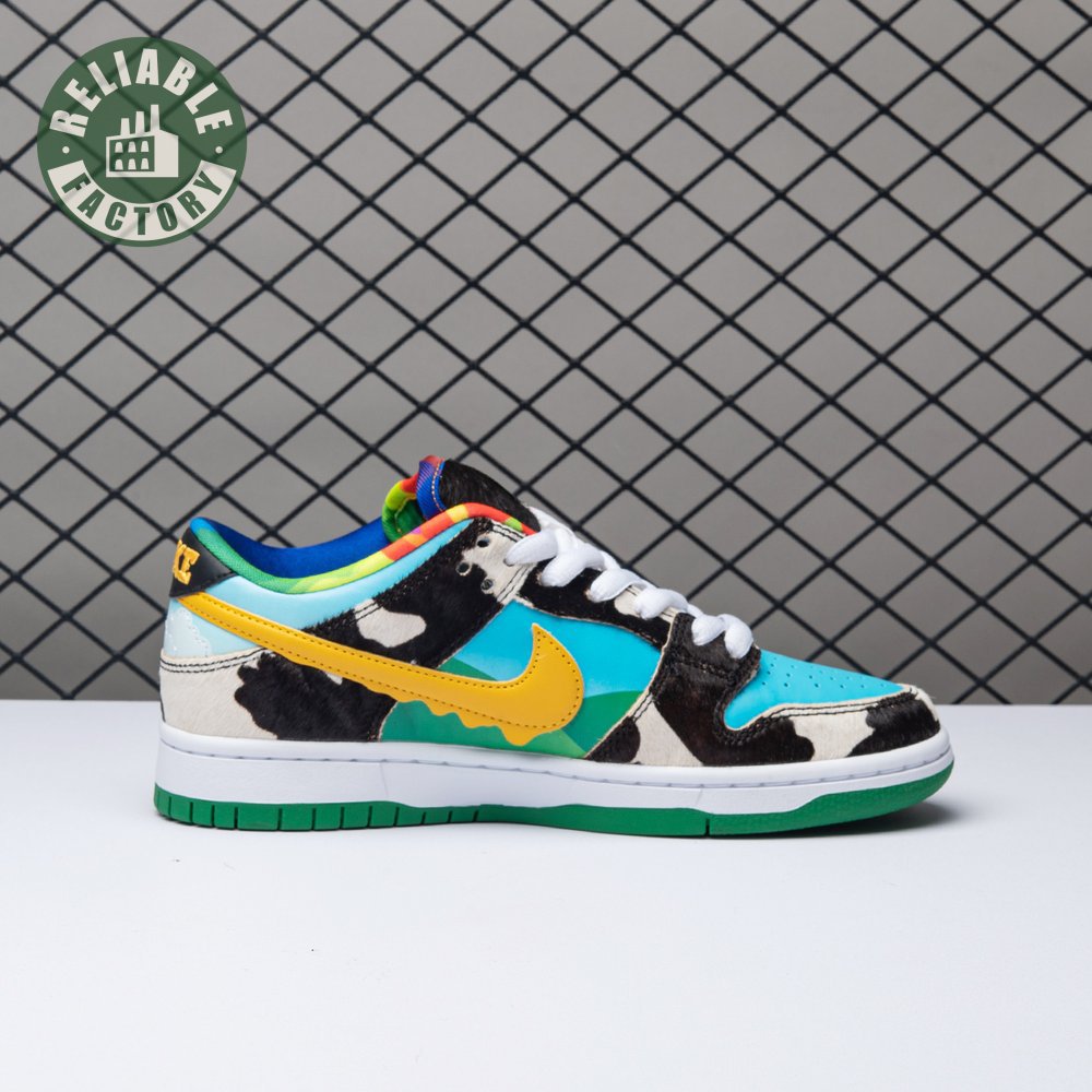 Made in collaboration with Ben & Jerry"s, the Nike Dunk Low SB "Chunky Dunky" replicates the packaging used for the ice cream brand"s Chunky Monkey flavor. The leather upper depicts blue skies and green pastures, while pony-hair overlays are rendered in a spotted cow print. A yellow leather Swoosh is treated to a melting ice cream effect for added visual flair. Atop the tongue, the woven tag features a Chunky Dunky callout alongside Nike SB branding.