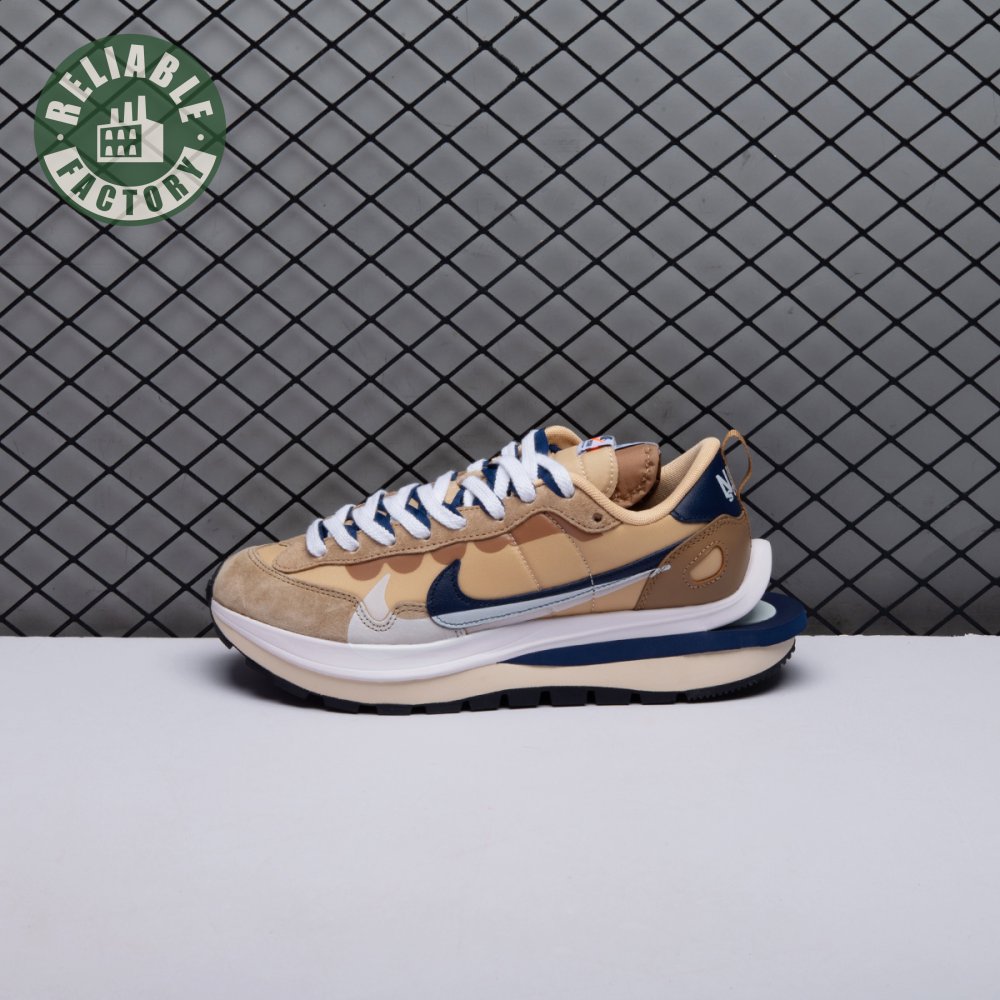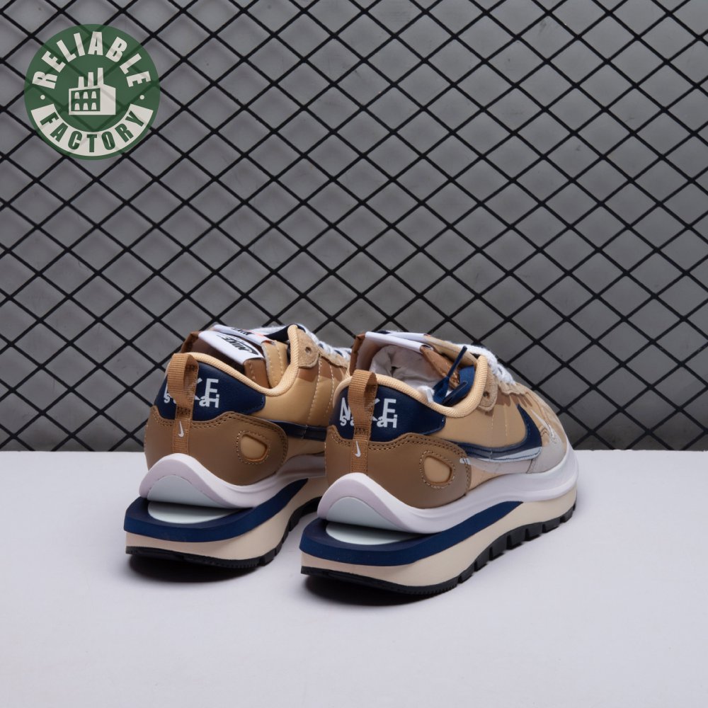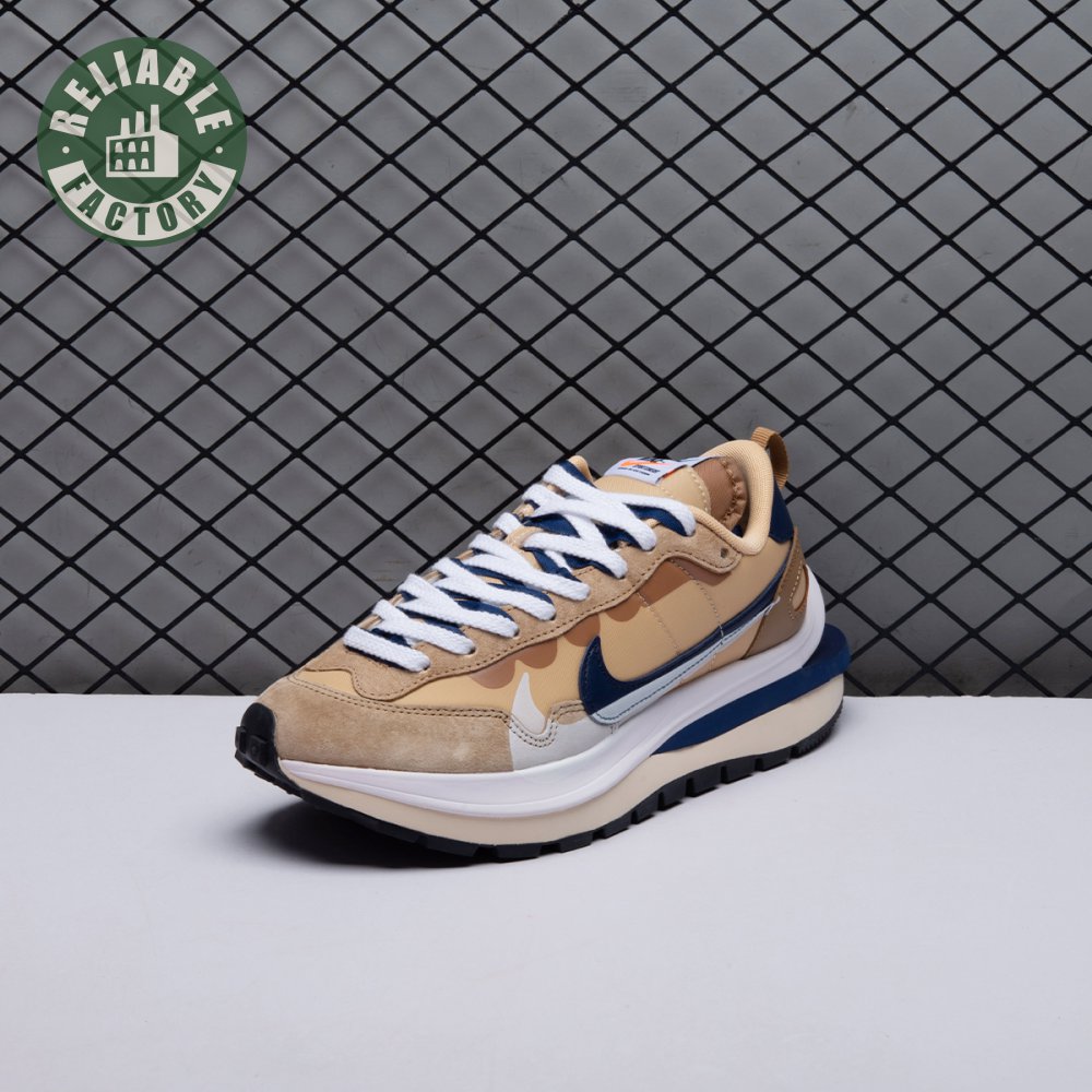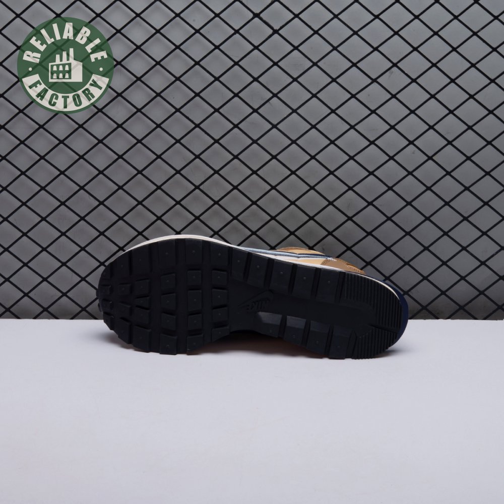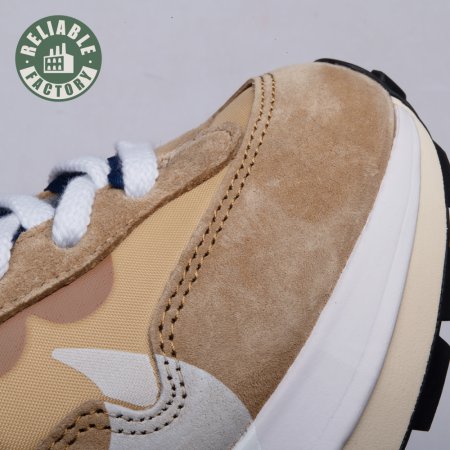 The sacai x Nike VaporWaffle "Sesame Blue Void" reunites the Swoosh with the Tokyo-based fashion label helmed by Chitose Abe. Blending elements from the modern Vaporfly and vintage Pegasus runner from 1983, the hybrid silhouette makes use of a khaki textile upper with tonal leather and suede overlays. A blue leather Swoosh is joined by a larger printed Swoosh in contrasting white. Tongues are similarly doubled up, each accented with a woven Nike tag. The sneaker rides on a dual-layered foam midsole, featuring split heel detailing and supported by a classic waffle tread outsole.