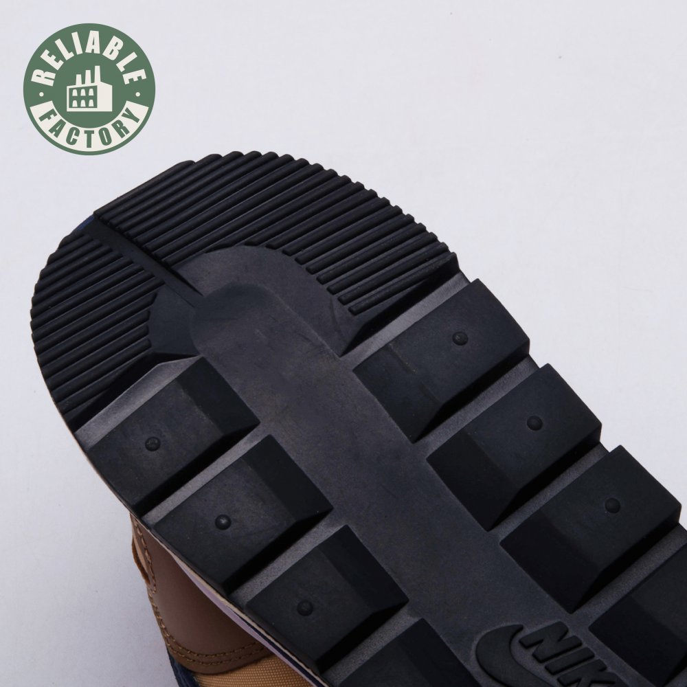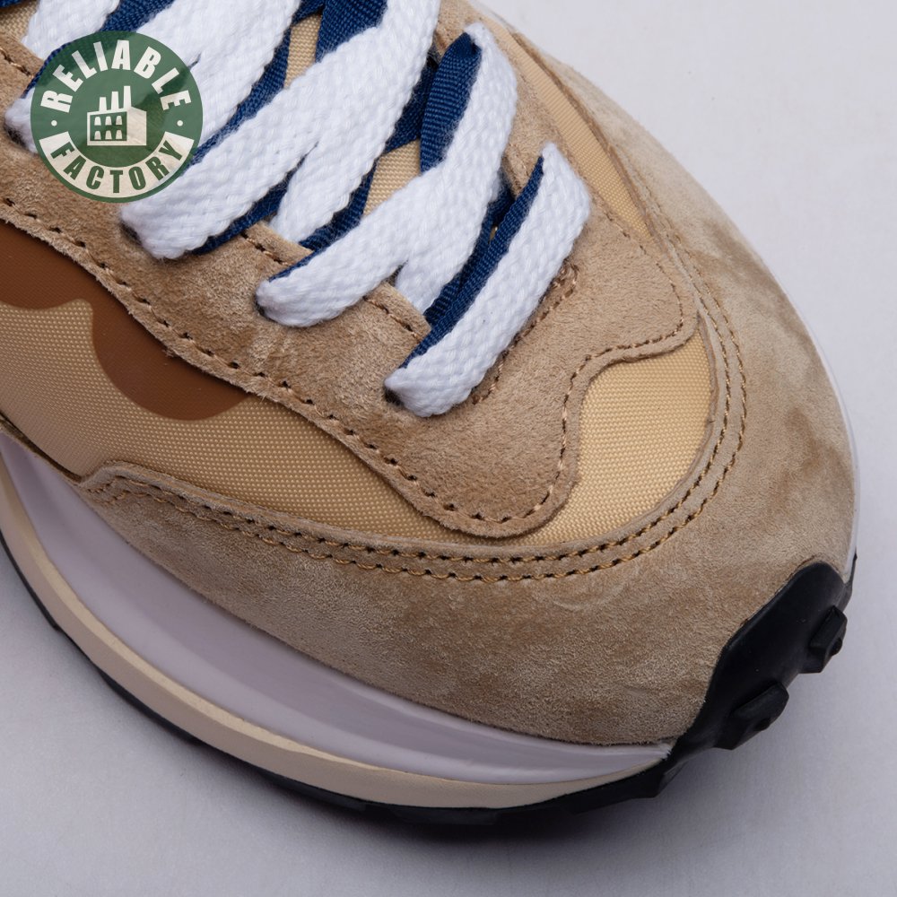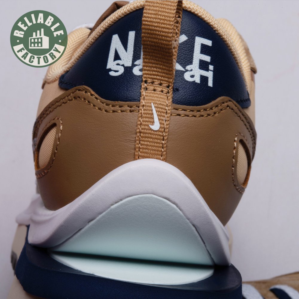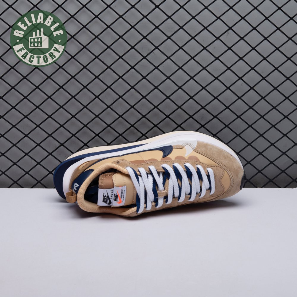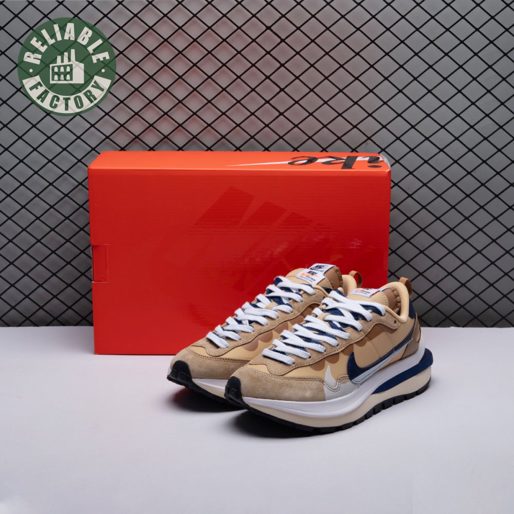 The sacai x Nike VaporWaffle "Sesame Blue Void" reunites the Swoosh with the Tokyo-based fashion label helmed by Chitose Abe. Blending elements from the modern Vaporfly and vintage Pegasus runner from 1983, the hybrid silhouette makes use of a khaki textile upper with tonal leather and suede overlays. A blue leather Swoosh is joined by a larger printed Swoosh in contrasting white. Tongues are similarly doubled up, each accented with a woven Nike tag. The sneaker rides on a dual-layered foam midsole, featuring split heel detailing and supported by a classic waffle tread outsole.